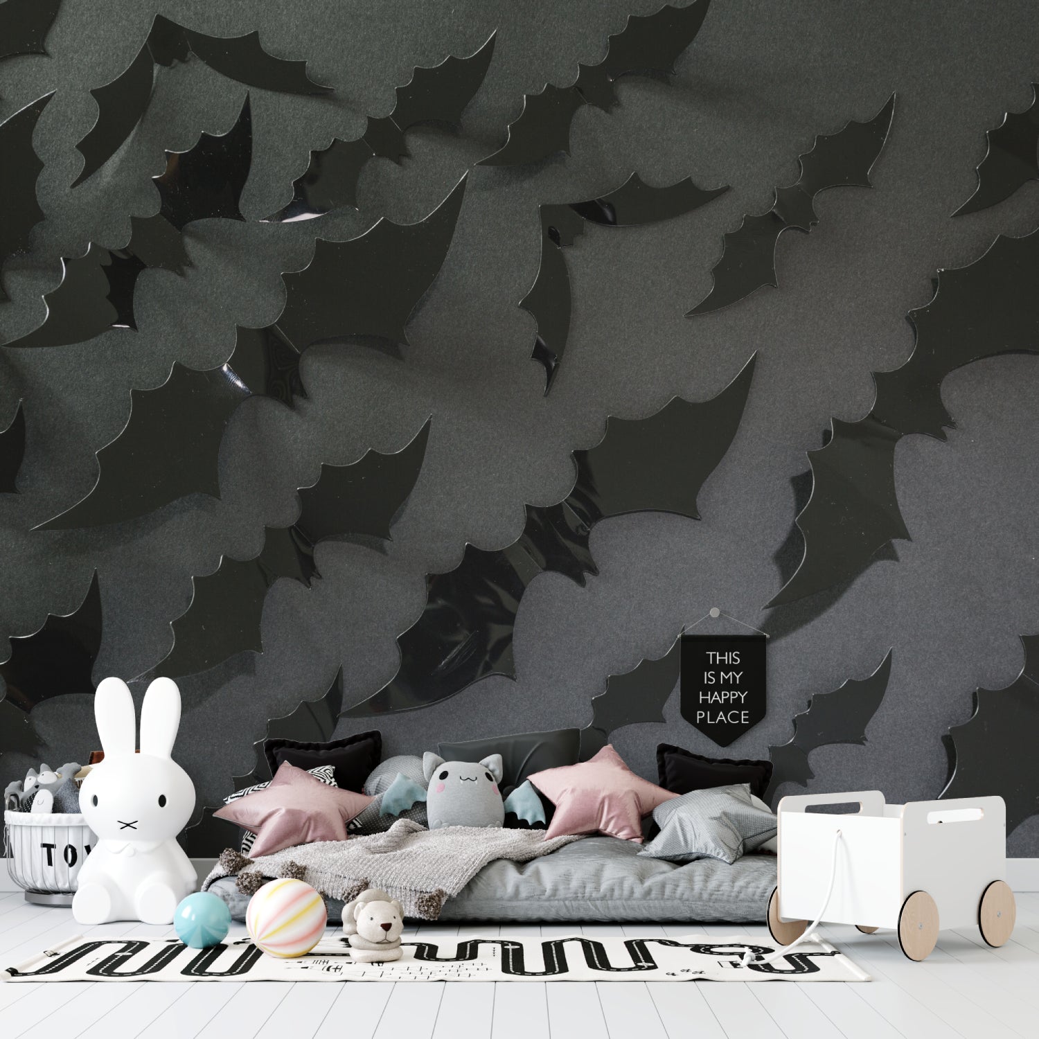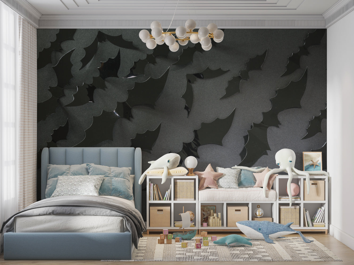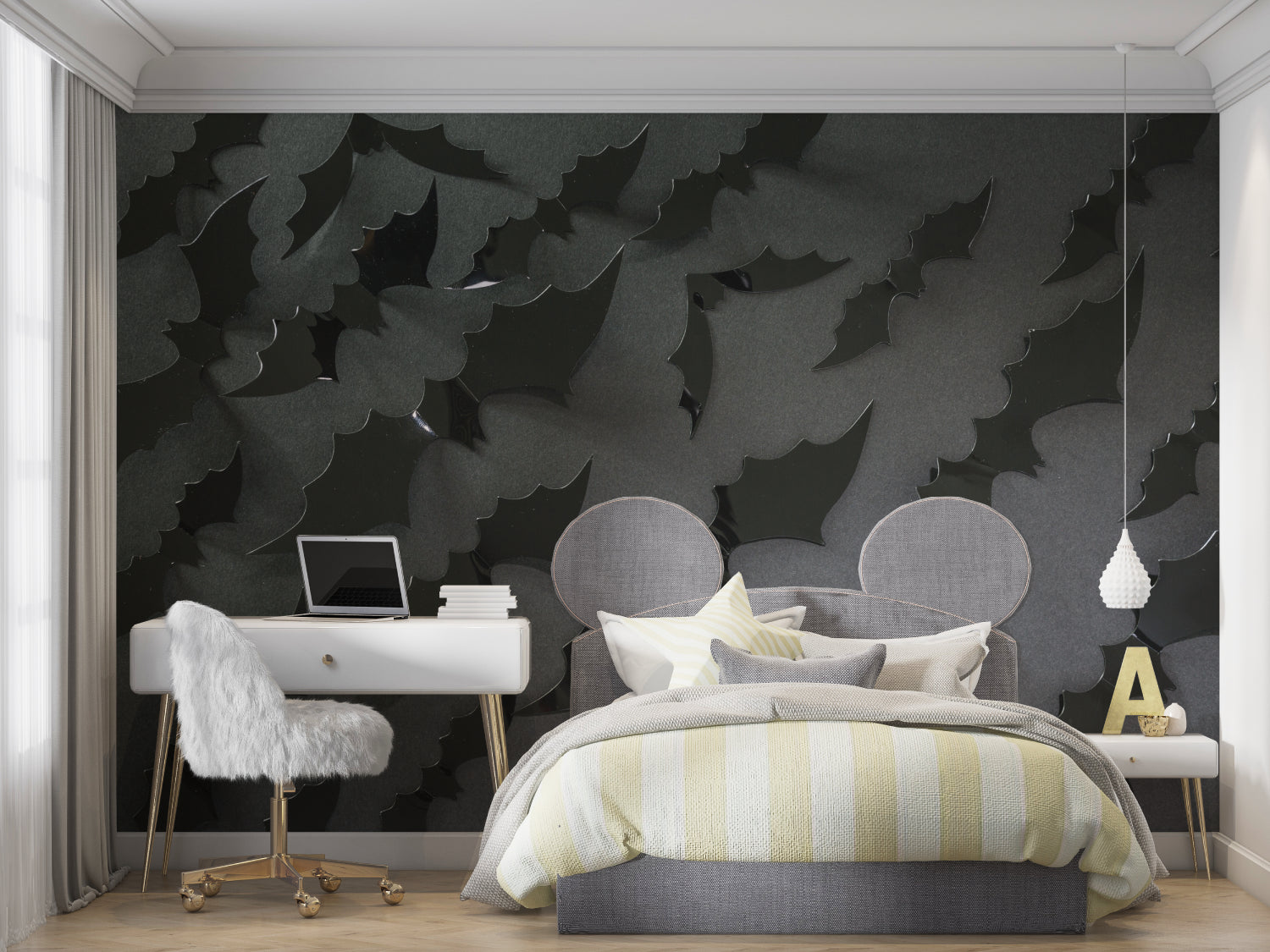 Denne 3D blad tapet viser et slående tredimensionelt design, hvor dybe kulfarvede blade ser ud til at svæve mod en mørk baggrund, hvilket skaber en imponerende følelse af dybde og bevægelse. Det sofistikerede sort mønster tapet har overlappende silhuetter, der kaster subtile skygger og etablerer en dynamisk, tredimensionel effekt, der bringer væggene til live med moderne elegance.