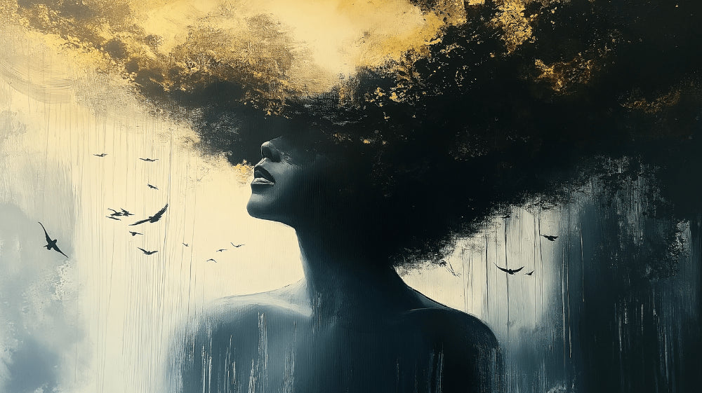 Denne abstrakte portræt tapet fanger en fængslende kunstnerisk vision, hvor mørke møder lys i perfekt harmoni. Den slående silhuet træder frem fra et lærred af dyb sort toner, sat mod en lysende gylden himmel stribet med æteriske dryp. Kompositionen forstærkes af yndefulde fugle i flugt, hvilket skaber en dramatisk vægmaleri, der taler om frihed og eftertanke.