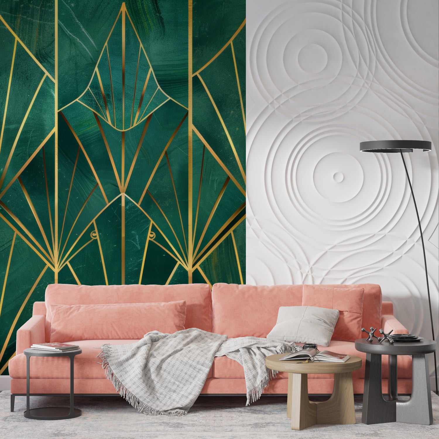 Art Deco Tapet | Smaragdgrøn og Guld Geometrisk Mønster