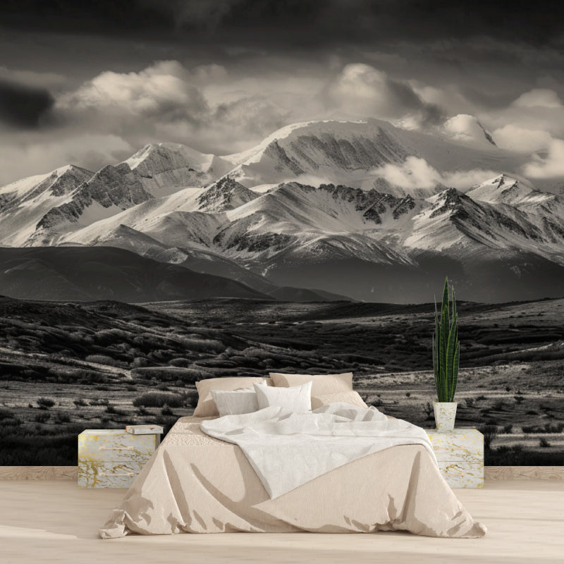 Denne bjergrige landskabstapet fanger den rå majestæt af sneklædte tinder mod en dramatisk monokrom himmel. Den skarpe kontrast mellem den klare hvide sne og dybe skygger skaber en fængslende visuel fortælling, mens lette skyer driver hen over de robuste tinder og tilføjer dybde og bevægelse til dette sort-hvide bjergmurale. Kompositionen balancerer mesterligt den utemmede vildmark med kunstnerisk forfinelse.