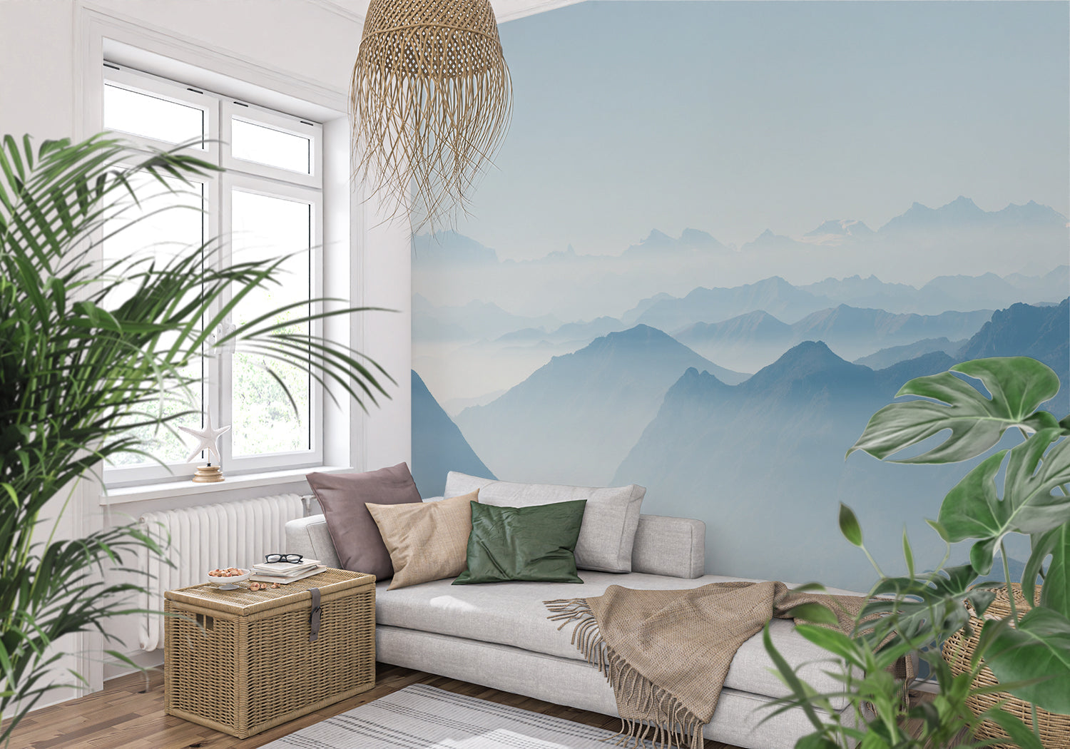 De bløde blå toner og tågede toppe skaber en fredelig flugt i dit hjem.