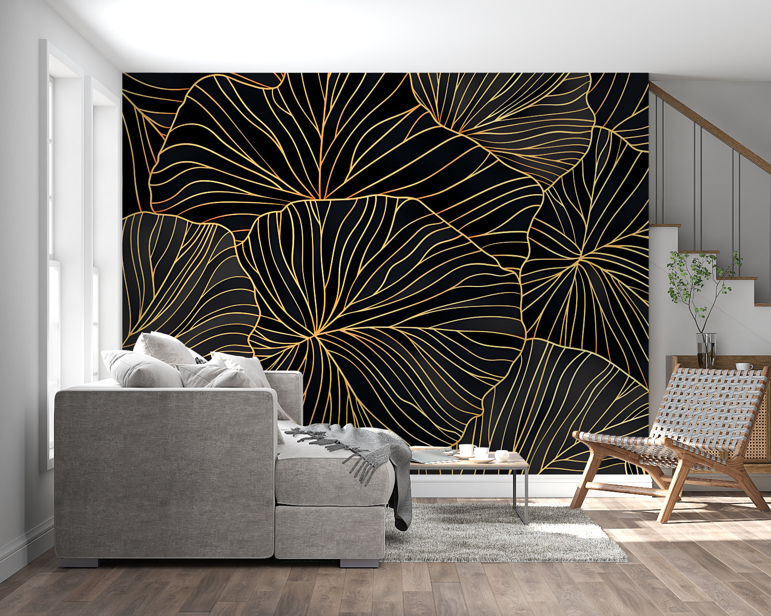 Denne sort og guld tapet viser et udsøgt mønster af overdimensionerede botaniske blade gengivet i skinnende gyldne linjer mod en dyb sort baggrund. Det sofistikerede art deco tapet har delikate lineære detaljer, der skaber et fascinerende rytmisk mønster, hvor hvert blads indviklede årer fanger og reflekterer lys med subtil elegance. Det dristige design i stor skala skaber et dramatisk udtryk, samtidig med at det bevarer en atmosfære af raffineret luksus.