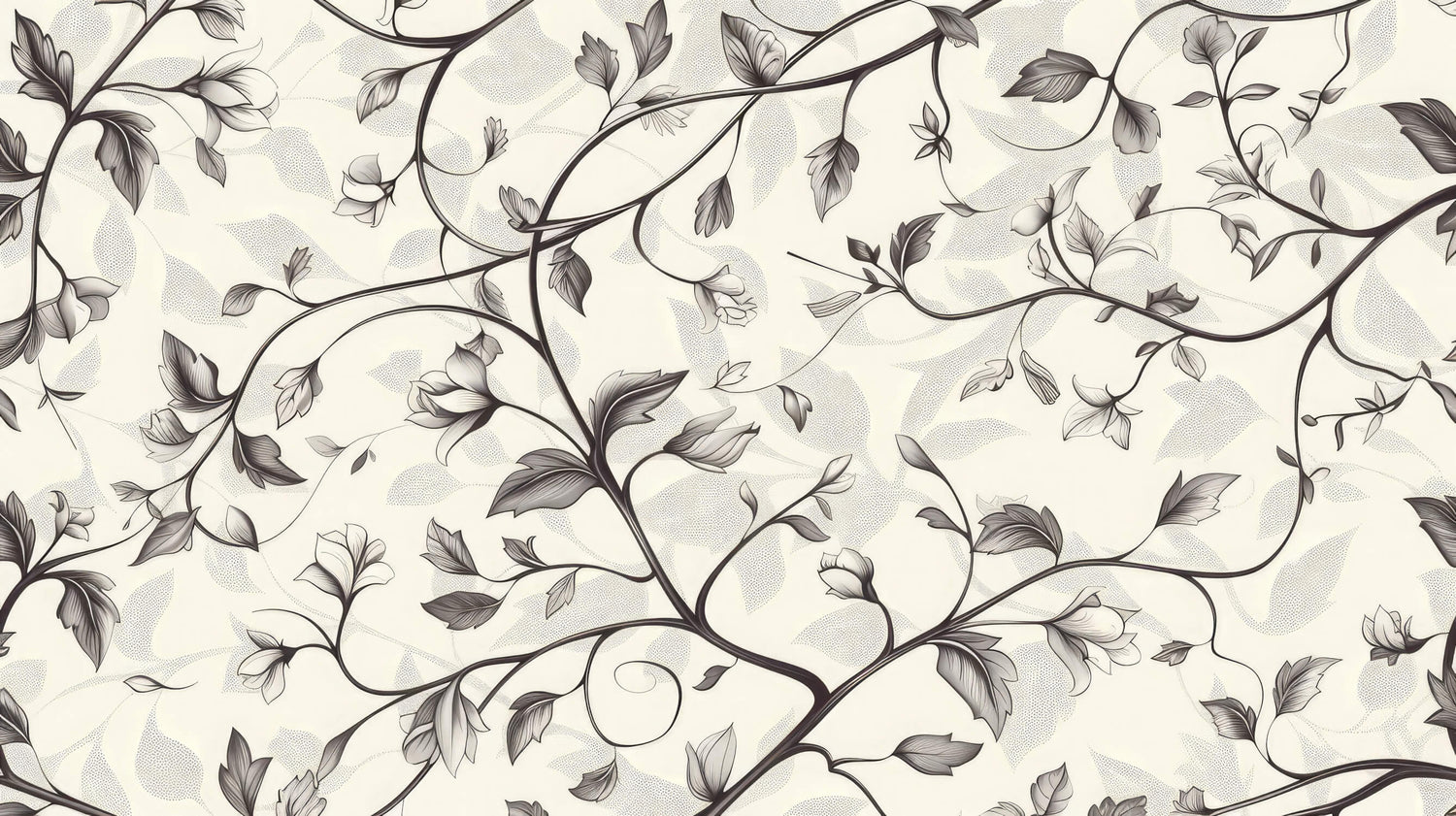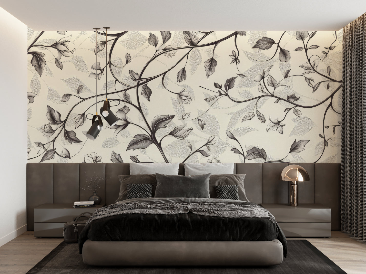 Denne botaniske tapet viser en fortryllende dans af yndefulde vinranker og delikate blomster gengivet i sofistikerede sort-hvide toner. Sat mod en varm elfenbensbaggrund, har den blomstrede vægmaleri ekspertmæssigt detaljerede blade og blomster, der skaber et flydende, organisk mønster. Hver buet stilk og omhyggeligt skyggefuld blomst bidrager til en komposition, der balancerer kunstnerisk forfinelse med naturlig bevægelse.