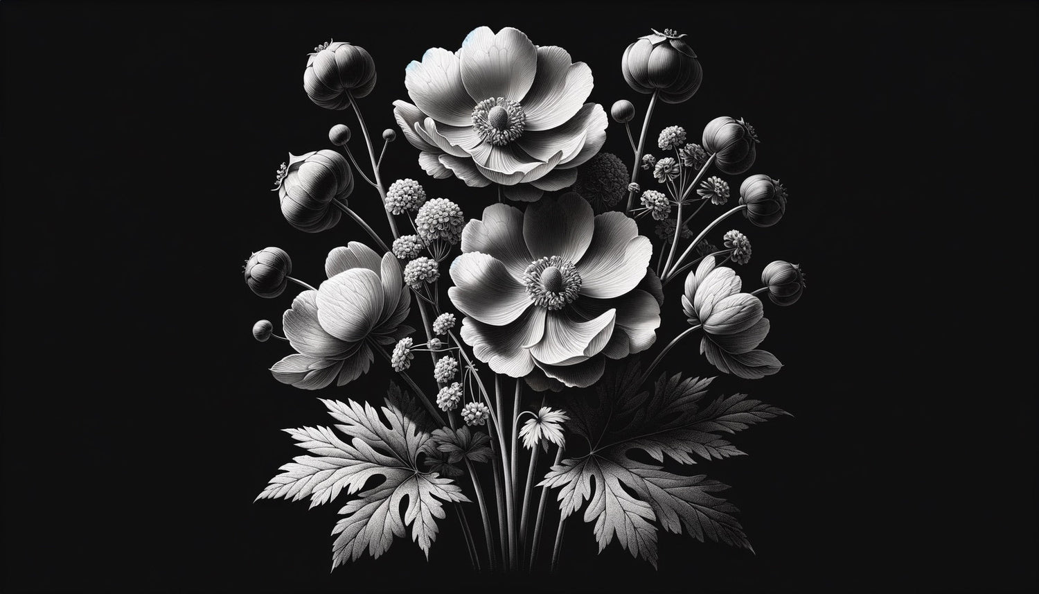 Denne sort-hvide blomster tapet viser en dramatisk botanisk opstilling, hvor sarte anemoneblomster tager centrum. Sat mod en dyb noir baggrund, viser de fotorealistiske blomster ekstraordinære detaljer i deres lagdelte kronblade og indviklede centre. Kompositionen inkluderer både fuldt åbnede blomster og runde knopper, suppleret med klynger af brudeslør og fjeragtigt løv, alt gengivet i sofistikerede gråtoner, der fremhæver hver subtil tekstur og skygge.