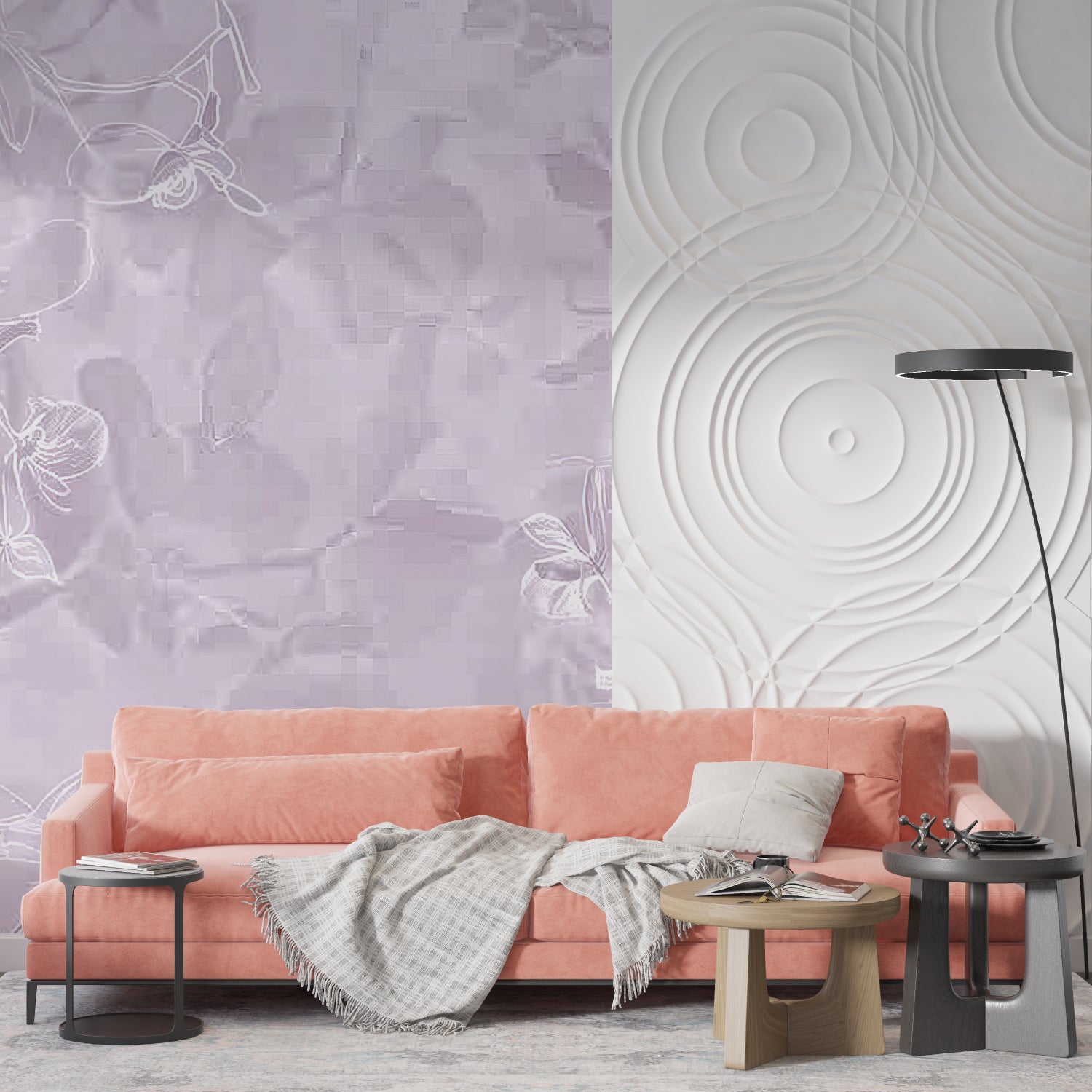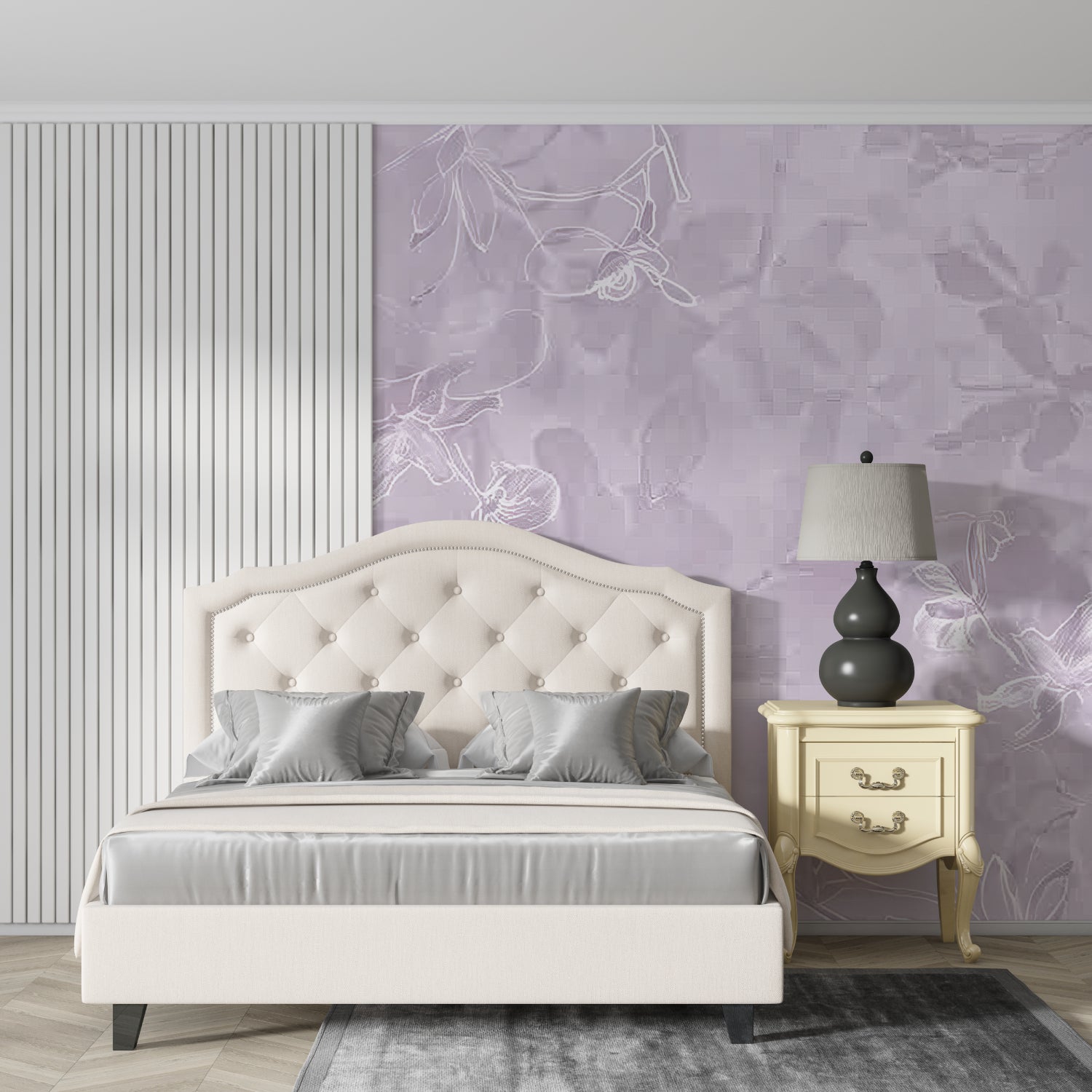 Dette lilla blomster tapet forvandler væggene til blid kunst.