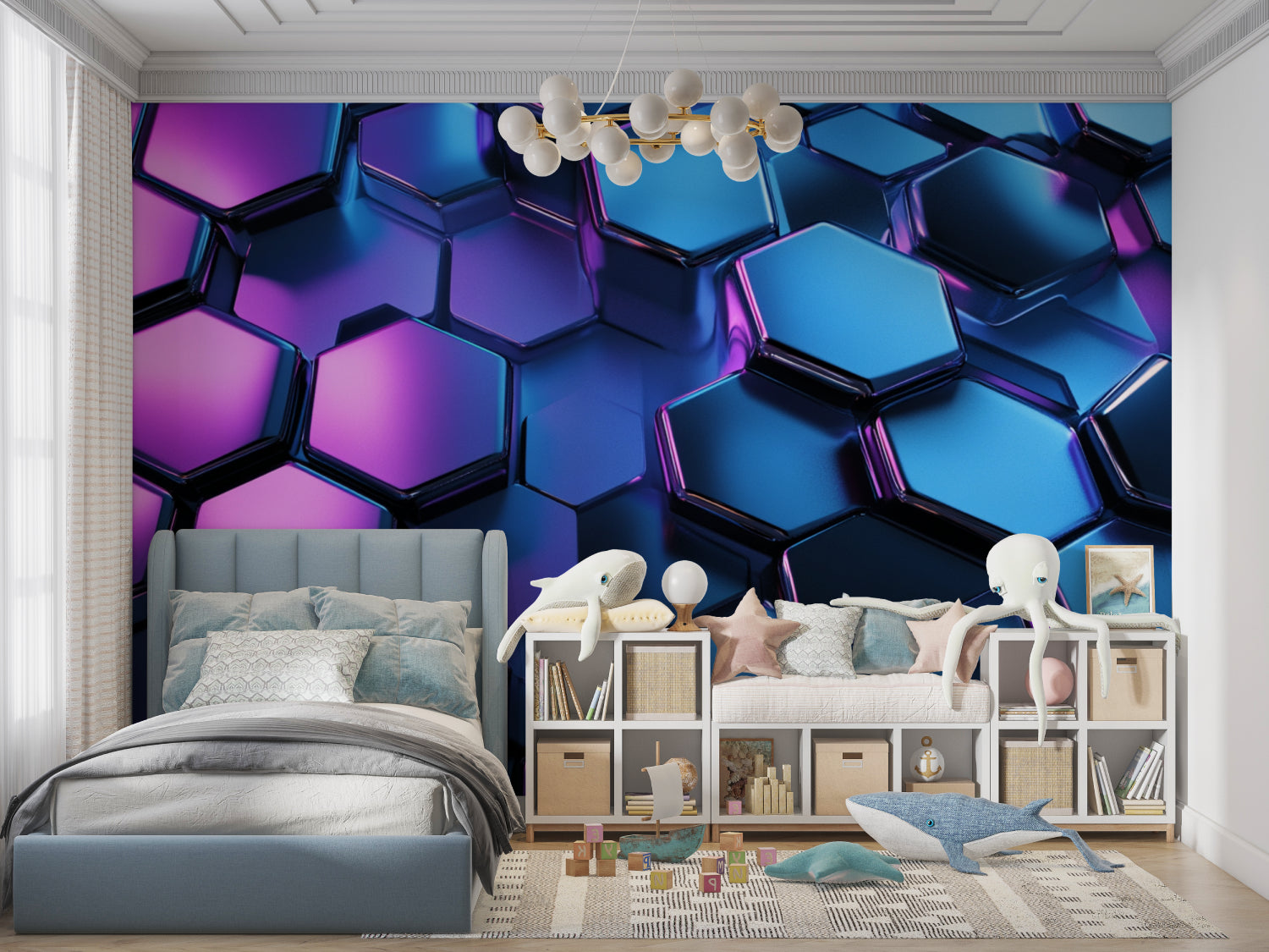 Geometrisk Tapet | 3D Hexagon Blå og Lilla Design