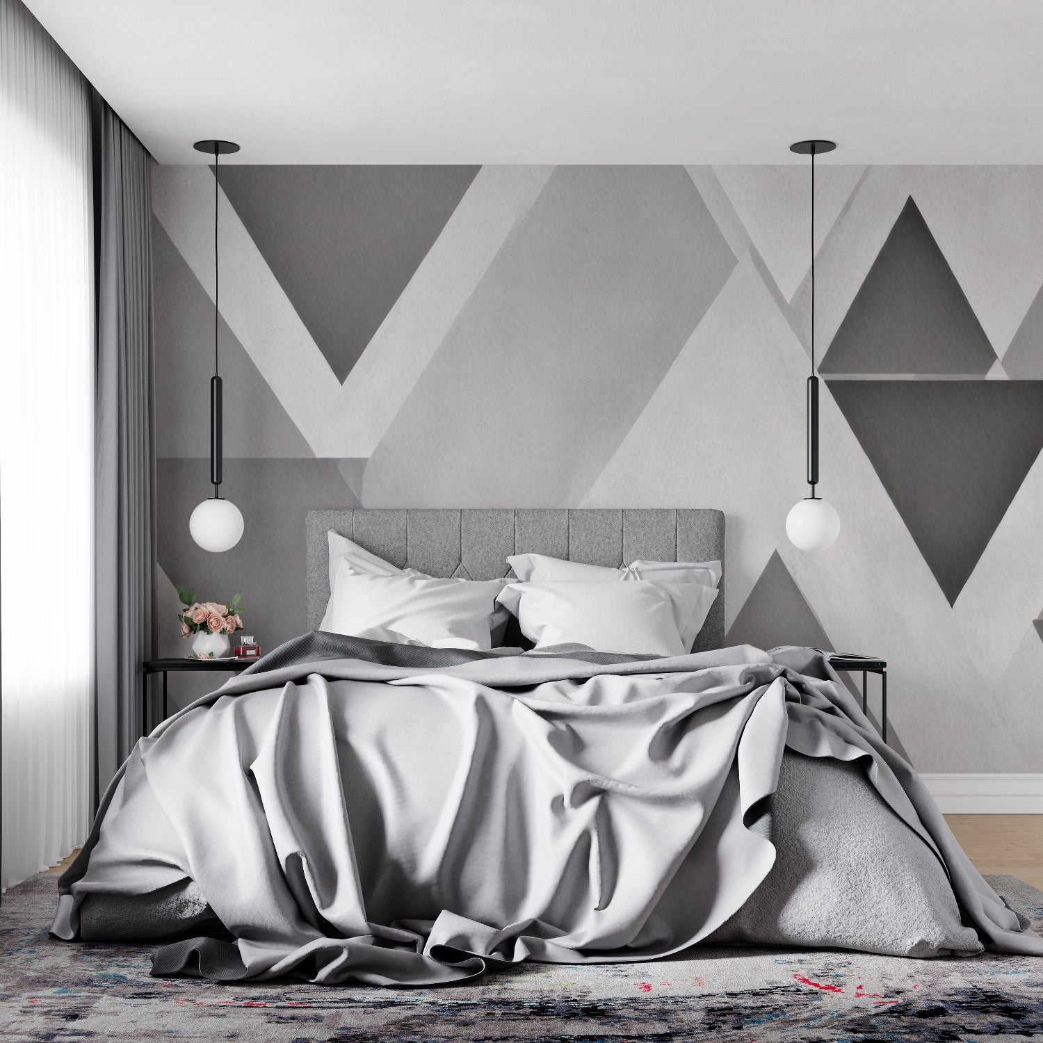 Denne geometriske vægmaleri viser et sofistikeret samspil af kantede former i forskellige nuancer af grå og hvid. Det dynamiske trekantede mønster skaber en dristig visuel udtalelse, samtidig med at det bevarer en luft af raffineret minimalisme. Den omhyggeligt afbalancerede komposition af moderne geometrisk tapet har skarpe linjer og dimensionelle skygger, der tilføjer dybde og arkitektonisk interesse til enhver væg.