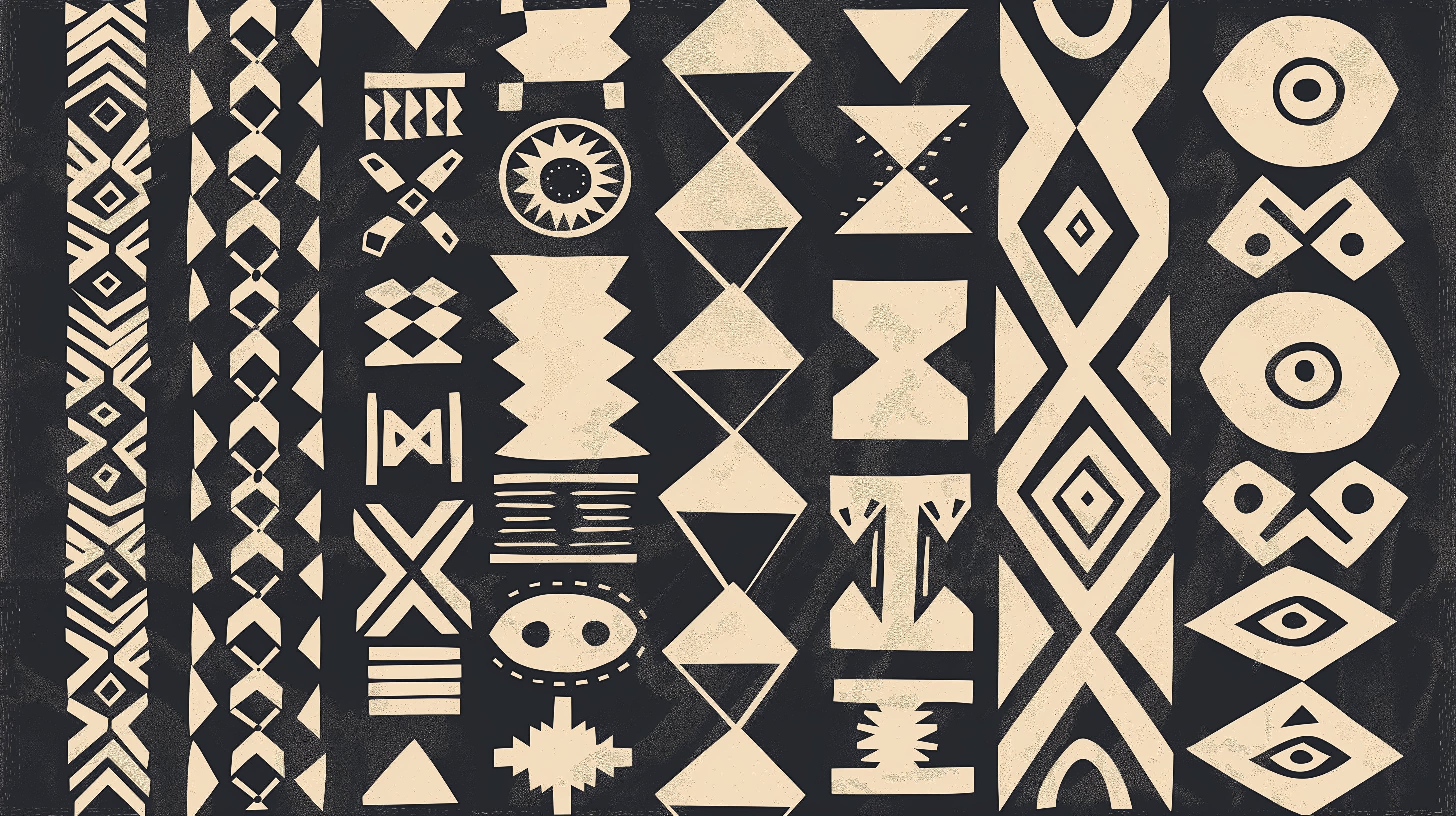 Denne geometriske stamme tapet viser et slående udvalg af dristige afrikansk-inspirerede motiver mod en dyb sort baggrund. De cremefarvede symboler skaber en fascinerende rytme af diamanter, chevrons, cirkler og abstrakte former arrangeret i lodrette bånd. Hvert element trækker på traditionelle etniske mønster tapet designs, med solsymboler, krydsede linjer og forfædres geometriske former, der taler til både arv og moderne designfølsomhed.