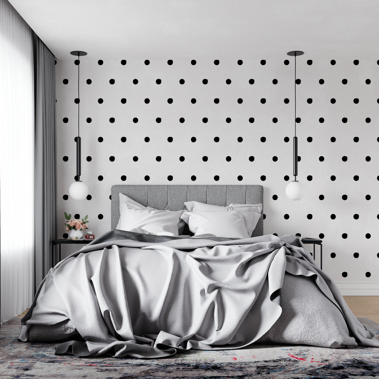 Denne sort-hvide prik tapet bringer øjeblikkelig charme til rum.