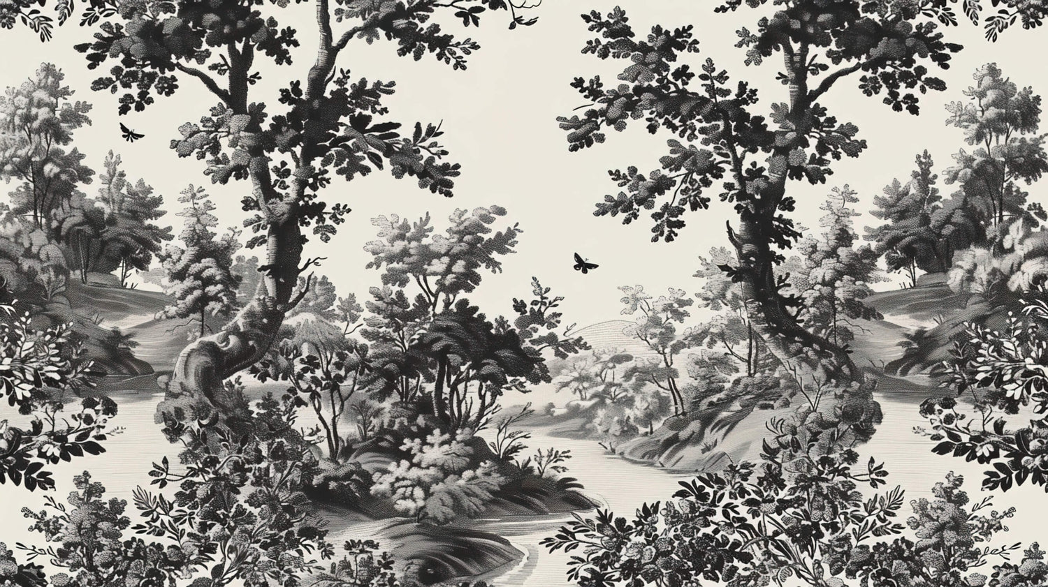 Denne sort-hvide landskabstapet viser en fortryllende skovscene gengivet i klassisk Toile de Jouy-stil. Majestætiske træer strækker deres detaljerede grene ud over en blød elfenbensfarvet baggrund, mens sarte fugle svæver gennem kompositionen. Det monokrome skovtapet skaber et sofistikeret samspil mellem lys og skygge med omhyggeligt gengivet løv og snoede stier, der trækker blikket ind i dets rolige dybder.