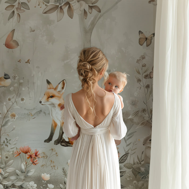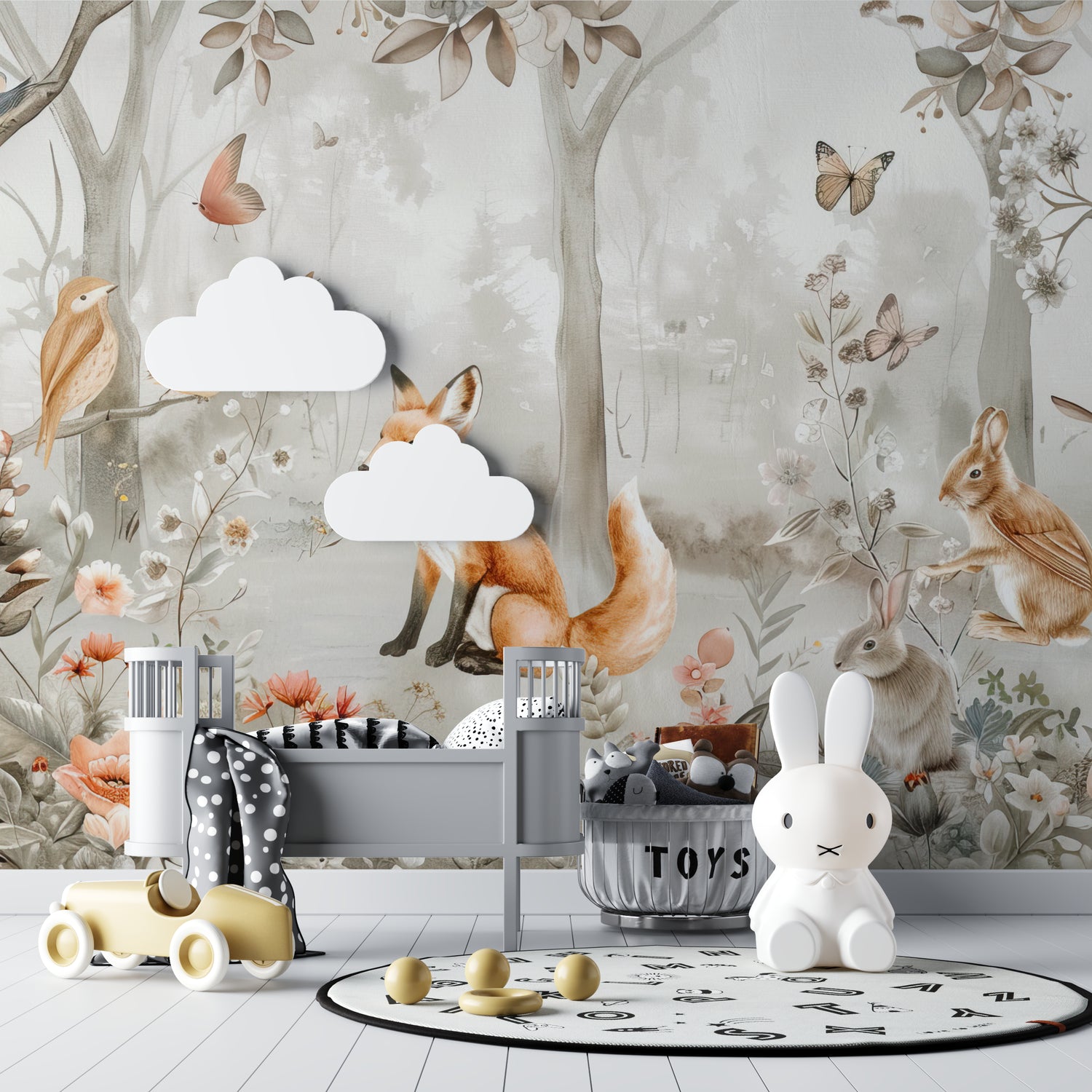 Vores skovdyr vægmaleri bringer blid udendørs charme ind.