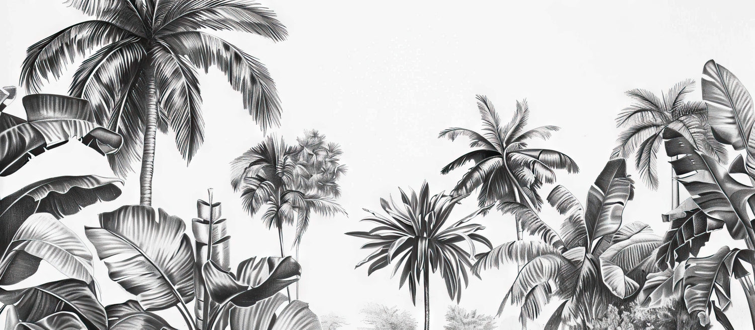 Denne tropiske palme tapet viser en kunstnerisk sammensætning af majestætiske palmer og eksotisk løv gengivet i sofistikerede sort-hvide toner. Den detaljerede illustration fanger hver yndefulde kurve af palmebladene og skaber et slående samspil mellem lys og skygge. Det monokrome tropiske tapet kombinerer botanisk præcision med kunstnerisk flair og præsenterer en harmonisk komposition af forskellige tropiske arter, herunder viftepalmer og bananblade.