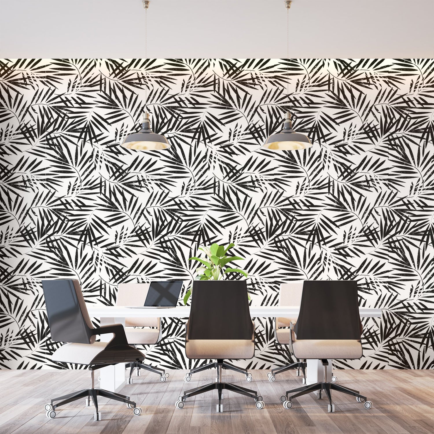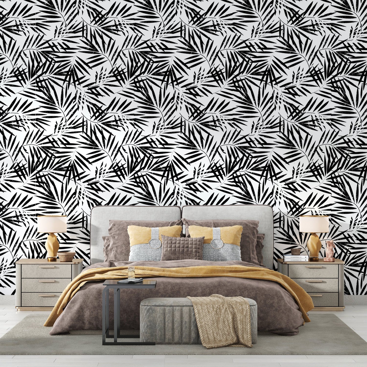 Denne sort-hvide palme tapet skaber et slående visuelt indtryk i ethvert rum.