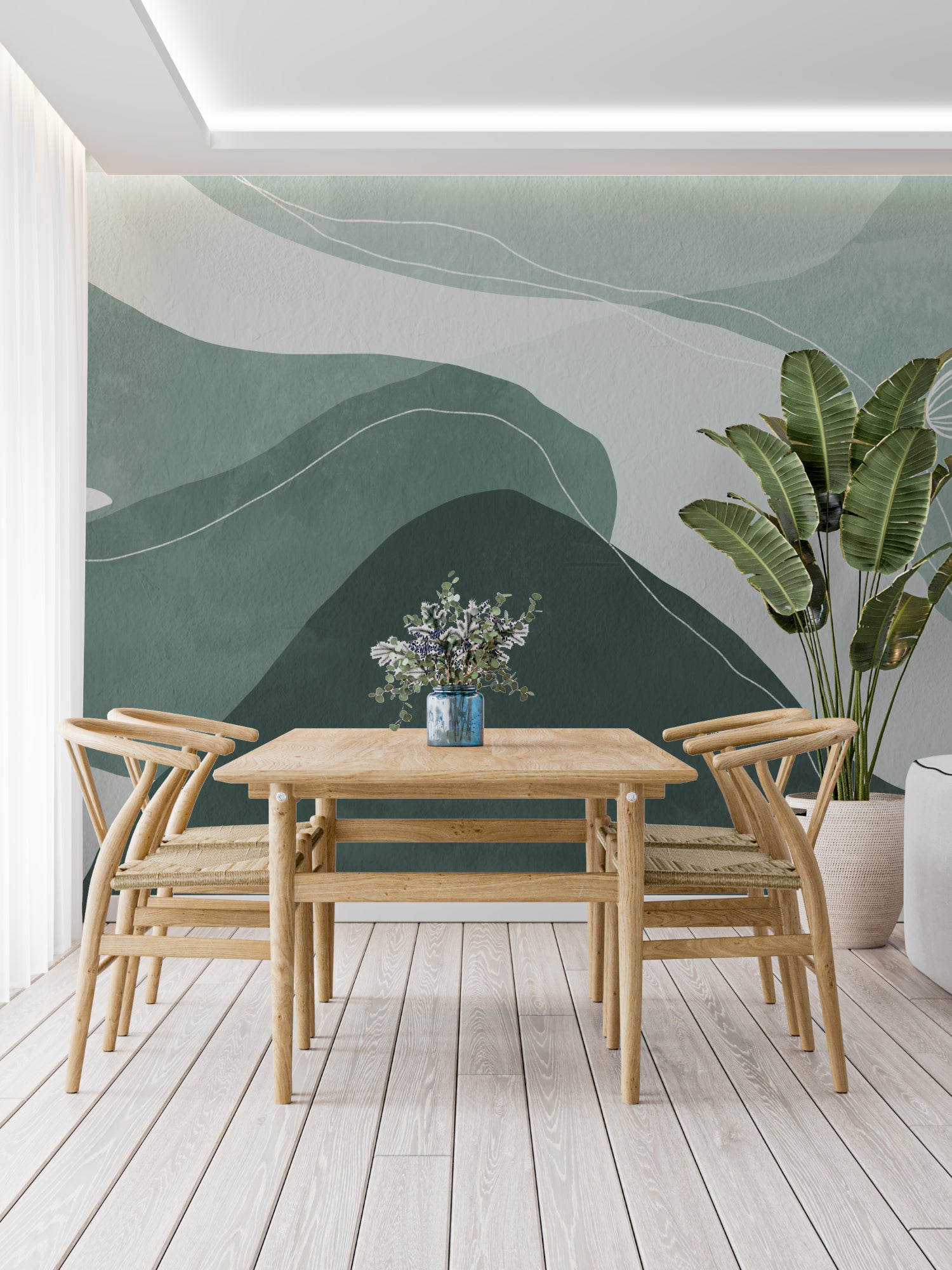 Verwandeln Sie jeden Raum in ein ruhiges Refugium mit dieser modernen abstrakten Tapete. Die beruhigende grüne Farbpalette und die organischen Formen wirken wunderbar, um eine natürliche, zenartige Atmosphäre zu schaffen und gleichzeitig zeitgenössische Eleganz zu bewahren. Dieses minimalistische Wandbild dient als künstlerischer Blickfang, der Tiefe und Raffinesse in Wohnräume, Schlafzimmer oder Büroumgebungen bringt und es zu einer vielseitigen Wahl für modernes Innendesign macht.