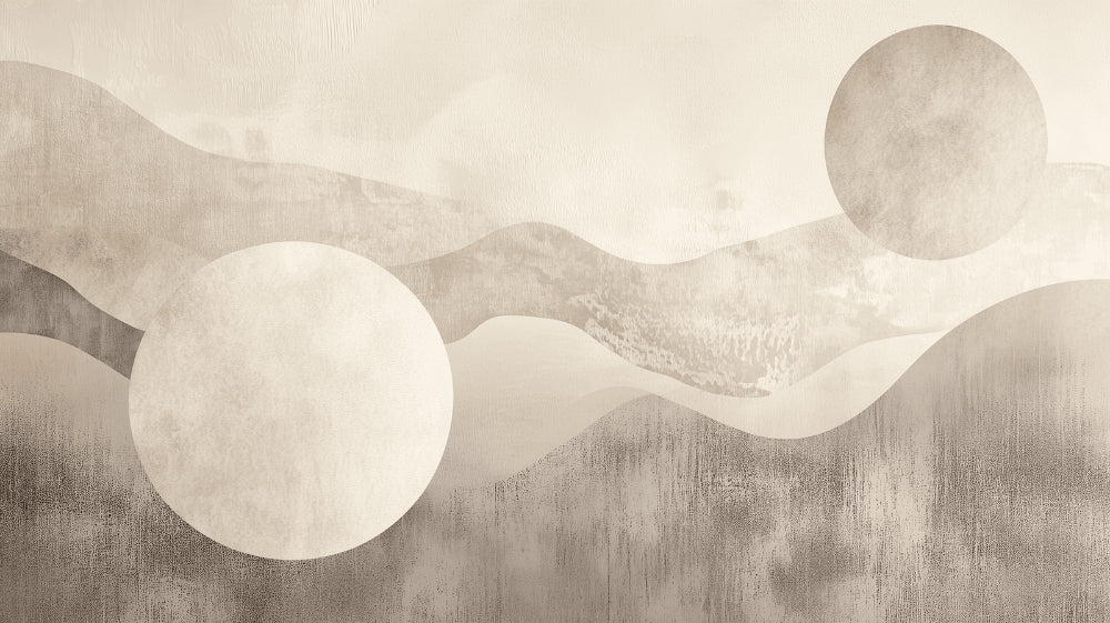 Diese abstrakte Landschaftstapete fängt die ätherische Schönheit einer mondbeschienenen Bergszene ein, dargestellt in anspruchsvollen neutralen Tönen. Große lunare Kreise schweben anmutig vor rollenden Bergsilhouetten und schaffen eine harmonische Komposition in warmen Beige- und subtilen Grauverläufen. Die minimalistische Bergtapete zeigt sanfte wellenförmige Linien und texturale Elemente, die Tiefe und visuelles Interesse in die verträumte Landschaft bringen.