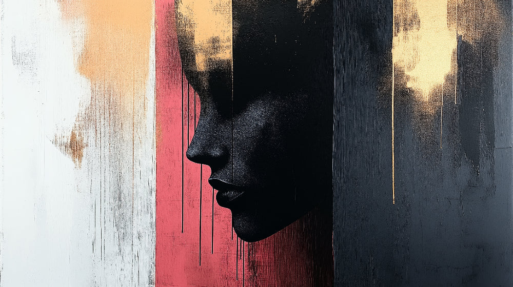 Diese abstrakte Kunsttapete präsentiert eine auffällige Komposition, in der Schatten auf Farbe trifft, in einer meisterhaften Darstellung zeitgenössischen Designs. Eine dramatische Silhouette entsteht aus einer Leinwand kontrastierender Elemente, bei der tropfende Farbtechniken vertikale Bewegung gegen Blöcke aus Korallenrot, metallischem Gold und tiefem Schwarz erzeugen. Das moderne Kunstwandbild zeigt ein raffiniertes Zusammenspiel von Textur und negativem Raum, wobei Pinselstriche rohe künstlerische Energie in das Werk einbringen.