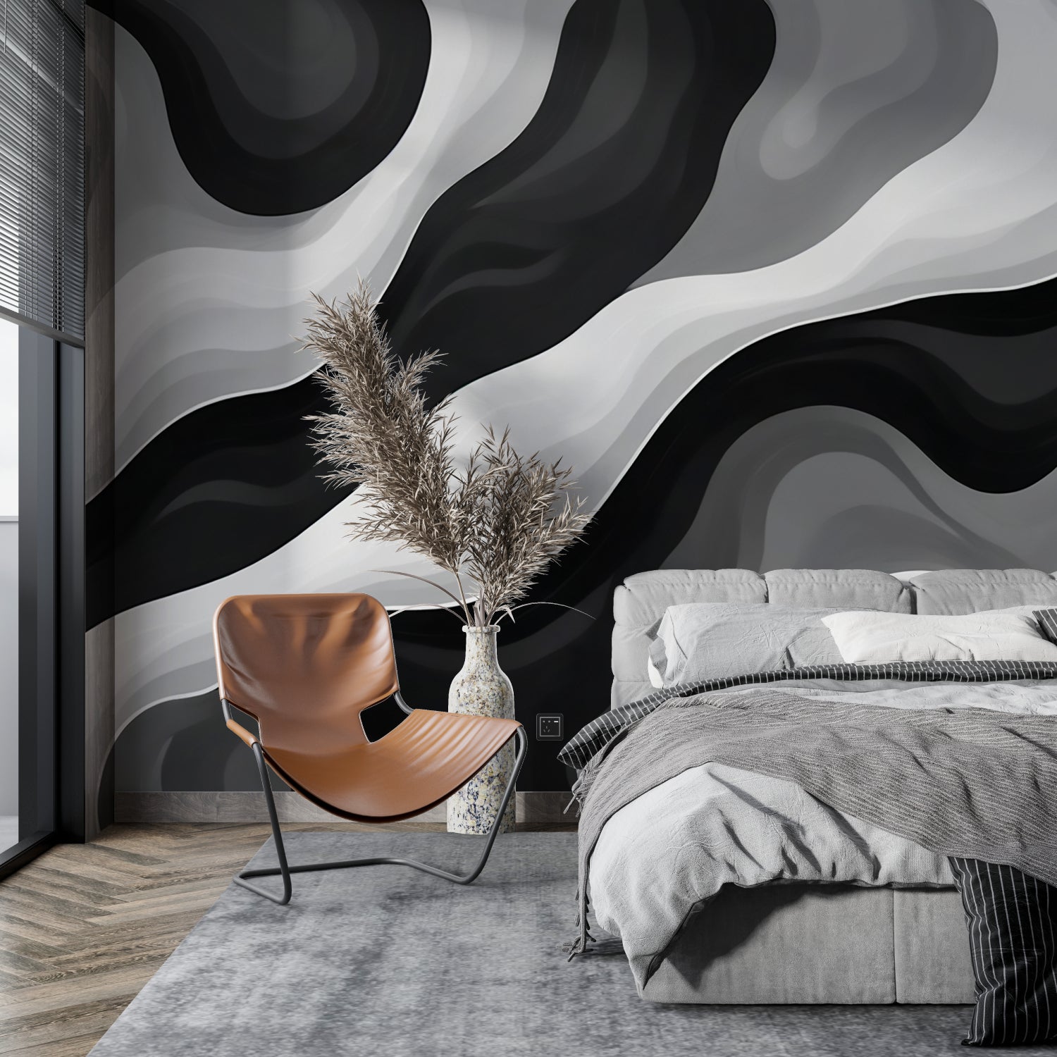 Diese abstrakte Wellen-Tapete zeigt ein faszinierendes Zusammenspiel fließender Formen in auffälligen monochromen Tönen. Die dynamische Komposition präsentiert kühne schwarze Wellen, die nahtlos durch verschiedene Grautöne fließen und eine anspruchsvolle moderne geometrische Tapete schaffen. Jede Kurve und jeder Farbverlauf wurde sorgfältig gestaltet, um ein Gefühl von Tiefe und Bewegung zu erzeugen und ein zeitgenössisches künstlerisches Statement zu bieten, das Aufmerksamkeit erregt.