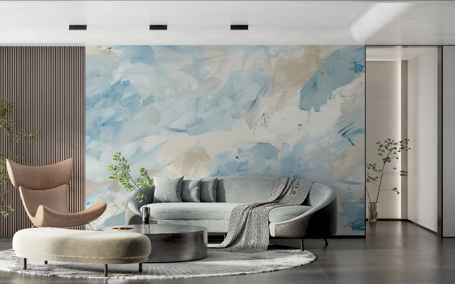 Verwandeln Sie Ihren Raum mit diesem zeitgenössischen Wandbild, das jeder Inneneinrichtung eine künstlerische Raffinesse verleiht. Die beruhigende Farbpalette dieser blau-beigen Tapete schafft eine ruhige Atmosphäre, die harmonisch in Wohnräumen, Schlafzimmern oder Büroumgebungen wirkt. Das vielseitige Design dient als atemberaubender Hintergrund, der sowohl minimalistische als auch moderne Dekorschemata aufwertet und dabei eine Aura von raffinierter Eleganz bewahrt.