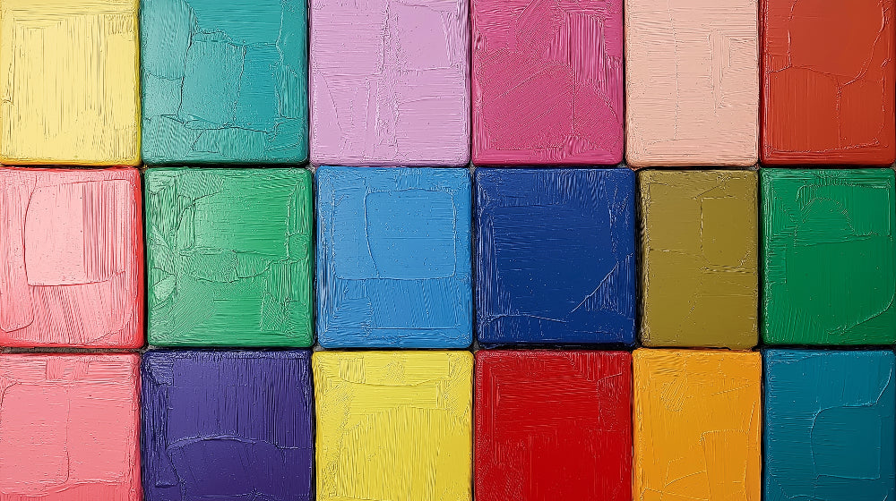 Diese abstrakte quadratische Tapete zeigt eine faszinierende Anordnung von strukturierten Blöcken in lebendigen Farbtönen. Jedes bemalte Quadrat weist reiche, dimensionale Texturen mit einem impastoähnlichen Finish auf, das einen auffälligen visuellen Rhythmus erzeugt. Die Farbpalette reicht von sonnigem Gelb und Türkisblau bis zu Korallenrosa und tiefem Marineblau, während das geometrische Wandbild ein perfektes Gleichgewicht zwischen künstlerischem Ausdruck und strukturiertem Design bewahrt.