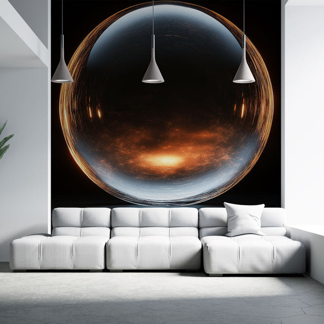 Diese abstrakte Kugel-Tapete fängt die Essenz kosmischer Schönheit durch ihr faszinierendes kreisförmiges Design ein. Die Komposition zeigt eine leuchtende Kugel, die scheinbar in unendlicher Dunkelheit schwebt, mit einer ätherischen Mischung aus tiefem Schwarz, strahlendem Gold und kühlen Silber-Blau-Tönen. Die 3D-Kugel-Tapete erzeugt einen außerweltlichen Portaleffekt, bei dem goldenes Licht von innen herausstrahlt und einen warmen Schein auf die kristalline Oberfläche dieser himmlischen Kugel wirft.