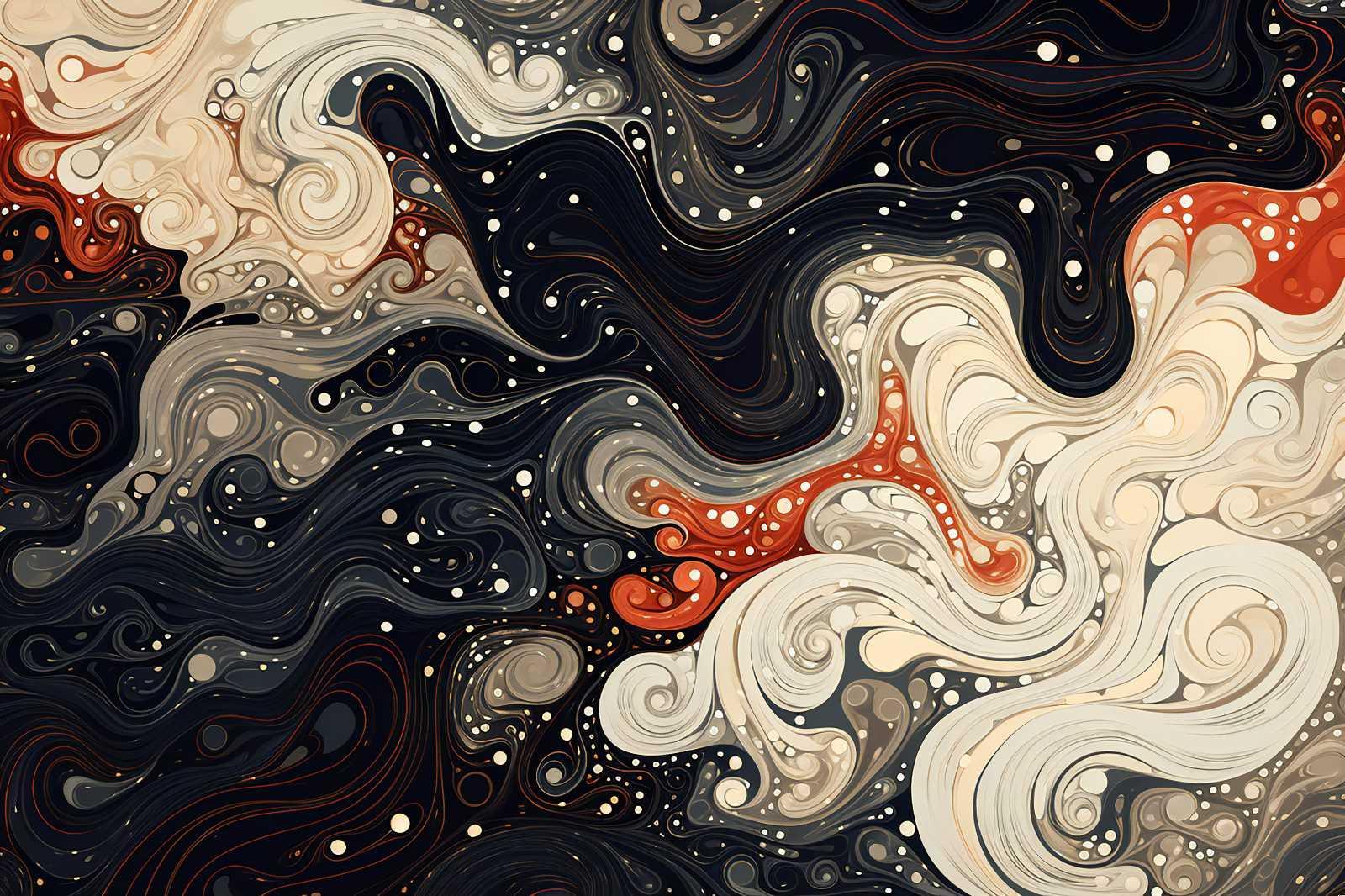Diese abstrakte flüssige Tapete zeigt einen faszinierenden Tanz wirbelnder Muster, die dramatische Kontraste mit künstlerischer Raffinesse verbinden. Tiefe Ebenholz-Wellen verweben sich mit Elfenbeinschwüngen, während strategische Terrakotta-Akzente Wärme und dynamische Energie in die Komposition bringen. Das moderne abstrakte Wandbild verfügt über zarte gepunktete Elemente, die über das gesamte Bild verstreut sind und einen himmlischen Effekt erzeugen, der Tiefe und Bewegung in das fließende Design bringt.