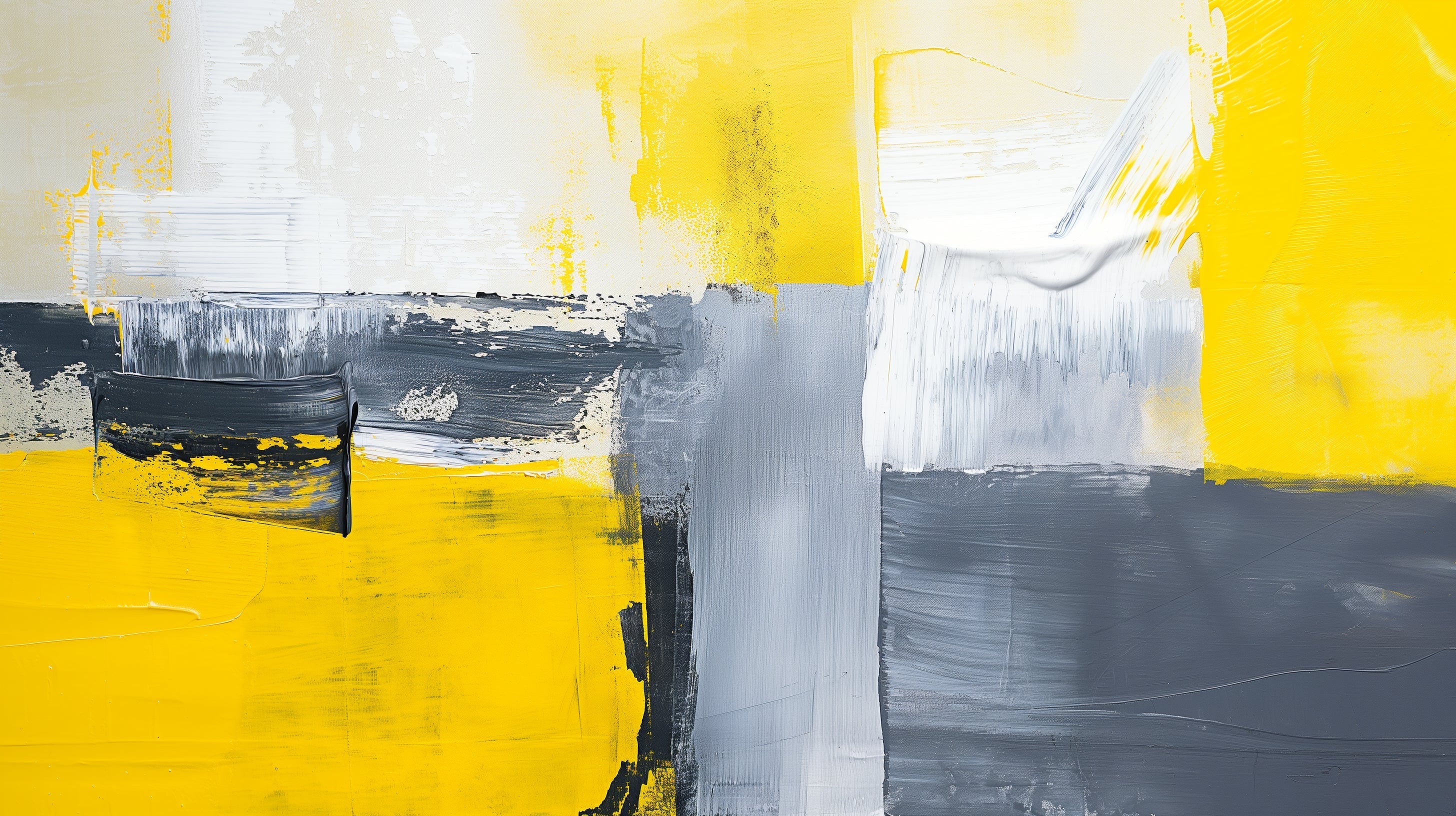 Diese abstrakte Wandtapete zeigt ein kühnes Zusammenspiel von lebhaftem Gelb und anspruchsvollen Grautönen und schafft eine auffällige zeitgenössische Komposition. Die dynamischen Pinselstriche und texturalen Elemente offenbaren eine künstlerische Tiefe, während die kontrastierenden weißen Akzente Helligkeit und Bewegung hinzufügen. Die moderne abstrakte Tapete verfügt über expressive Gesten und geschichtete Farbeffekte, die ein Gefühl von Bewegung und Energie über die Oberfläche erzeugen.