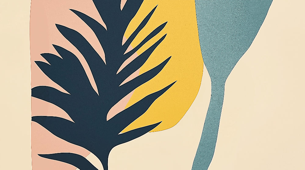 Diese abstrakte Blättertapete zeigt eine auffällige Komposition aus modernen Formen und sanften Farbharmonien. Eine kühne, marineblaue Palmenblattsilhouette steht im Mittelpunkt vor einem sorgfältig ausgewählten Hintergrund aus senfgelben, rosafarbenen und salbeiblauen Formen. Die moderne botanische Tapete schafft ein raffiniertes Zusammenspiel zwischen organischen Formen und geometrischen Farbblöcken und bietet eine zeitgenössische Interpretation des von der Natur inspirierten Designs.