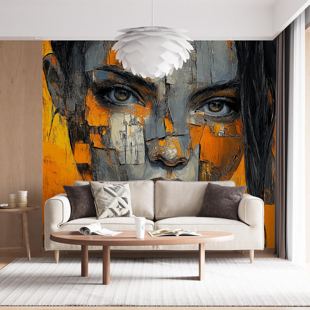 Diese fesselnde abstrakte Porträt-Tapete zeigt eine meisterhafte Verschmelzung von Orange- und Grautönen und schafft eine eindrucksvolle künstlerische Aussage. Die strukturierten Pinselstriche und die fragmentierte Komposition enthüllen intensive Augen und zarte Gesichtszüge, die aus einem lebendigen orangen Hintergrund hervortreten. Die moderne Kunsttapete demonstriert außergewöhnliche Tiefe durch ihre Schichttechnik, bei der kühne geometrische Segmente auf fließenden künstlerischen Ausdruck treffen.