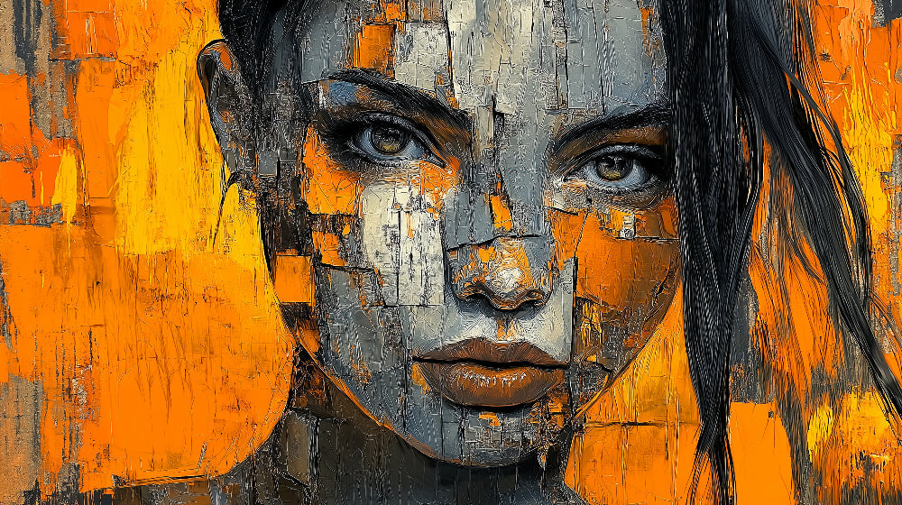 Verwandeln Sie Ihren Raum mit diesem zeitgenössischen Wandbild, das sowohl als künstlerisches Herzstück als auch als Gesprächsanlass dient. Das abstrakte Porträt-Design bringt Raffinesse und urbanen Charakter in jedes Interieur, sei es in einem kreativen Studio, einem modernen Wohnraum oder einem dynamischen Büro. Das Zusammenspiel von warmen Orange- und kühlen Grautönen erzeugt eine kraftvolle visuelle Wirkung und bewahrt gleichzeitig ein Gefühl von Balance und künstlerischer Verfeinerung.