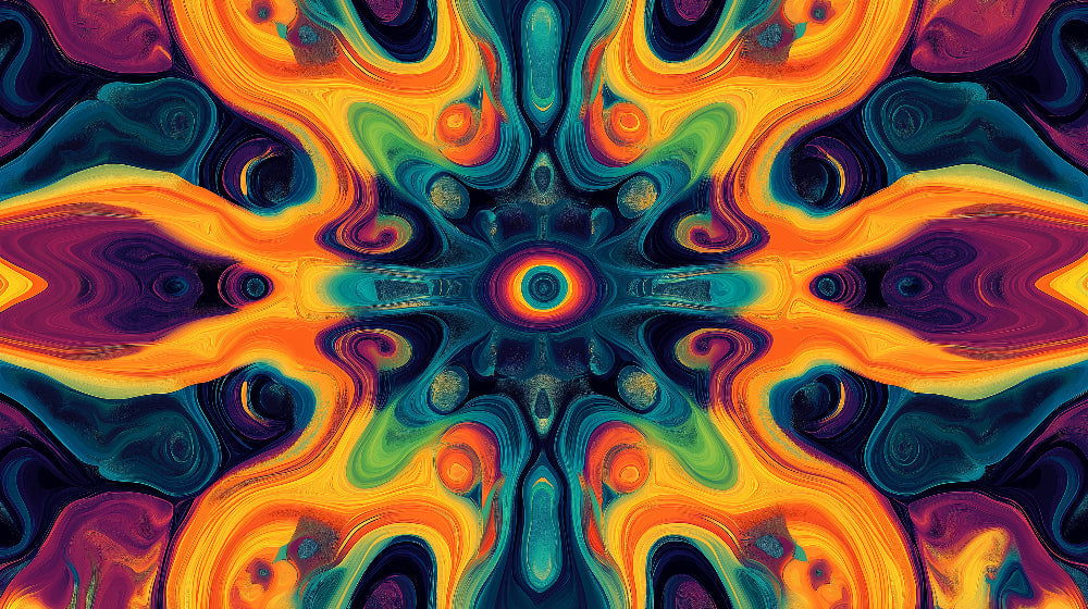 Diese faszinierende abstrakte Wandtapete zeigt eine kaleidoskopische Explosion von Farbe und Bewegung. Das Design konzentriert sich auf einen strahlenden Kern, der sich in fließenden, symmetrischen Wellen aus Türkis, Orange, Gelb und Tiefviolett nach außen ausbreitet. Jedes wirbelnde Muster erzeugt einen hypnotischen Fluss, während die moderne abstrakte Tapete durch ihre spiegelbildliche Komposition und reichen Farbverläufe perfekte Balance hält.