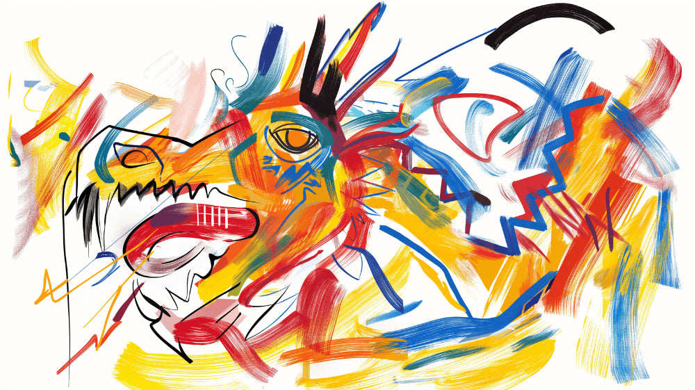 Diese abstrakte Drachen-Tapete sprüht vor dynamischer Energie durch kühne, expressive Pinselstriche und eine lebendige Farbpalette. Der wilde Drache taucht aus einer Symphonie von Gelb-, Rot- und Blautönen auf und schafft mit seinem markanten Linienkunststil einen kraftvollen Blickfang. Die moderne Street-Art-Tapete verbindet rohe künstlerische Ausdruckskraft mit präziser Linienführung, wobei jeder Pinselstrich über den weißen Hintergrund zu tanzen scheint und eine Feier der kreativen Freiheit darstellt.