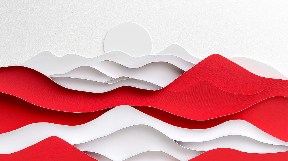 Diese abstrakte Bergtapete zeigt ein auffälliges Zusammenspiel von roten und weißen Wellen, gestaltet in einem zeitgenössischen 3D-Schichtdesign. Die kühne Komposition zeigt wellenförmige, bergähnliche Formen, die ein Gefühl von Tiefe und Bewegung erzeugen, während die makellose weiße Sonnenscheibe über der geometrischen Landschaftstapete schwebt. Jede Schicht ist sorgfältig ausgearbeitet, um einen skulpturalen Effekt zu erzielen, der dramatische rote Wellen mit subtilen weißen Verläufen in einem harmonischen visuellen Rhythmus kombiniert.