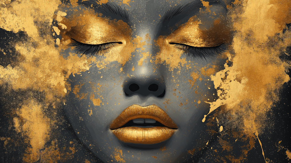 Diese abstrakte Gesichts-Tapete zeigt ein faszinierendes künstlerisches Porträt, das in einer raffinierten Palette aus Grau und Gold dargestellt ist. Die auffällige Komposition zeigt zarte Wimpern, leuchtenden goldenen Lidschatten und präzise detaillierte Lippen, die alle durch metallische Goldspritzer hervorgehoben werden, die über die graue Leinwand tanzen. Jedes Element verschmilzt nahtlos zu einer fesselnden Darstellung zeitgenössischer Kunst und schafft mit seinem dramatischen Kontrast und der texturalen Tiefe einen kraftvollen Blickfang.