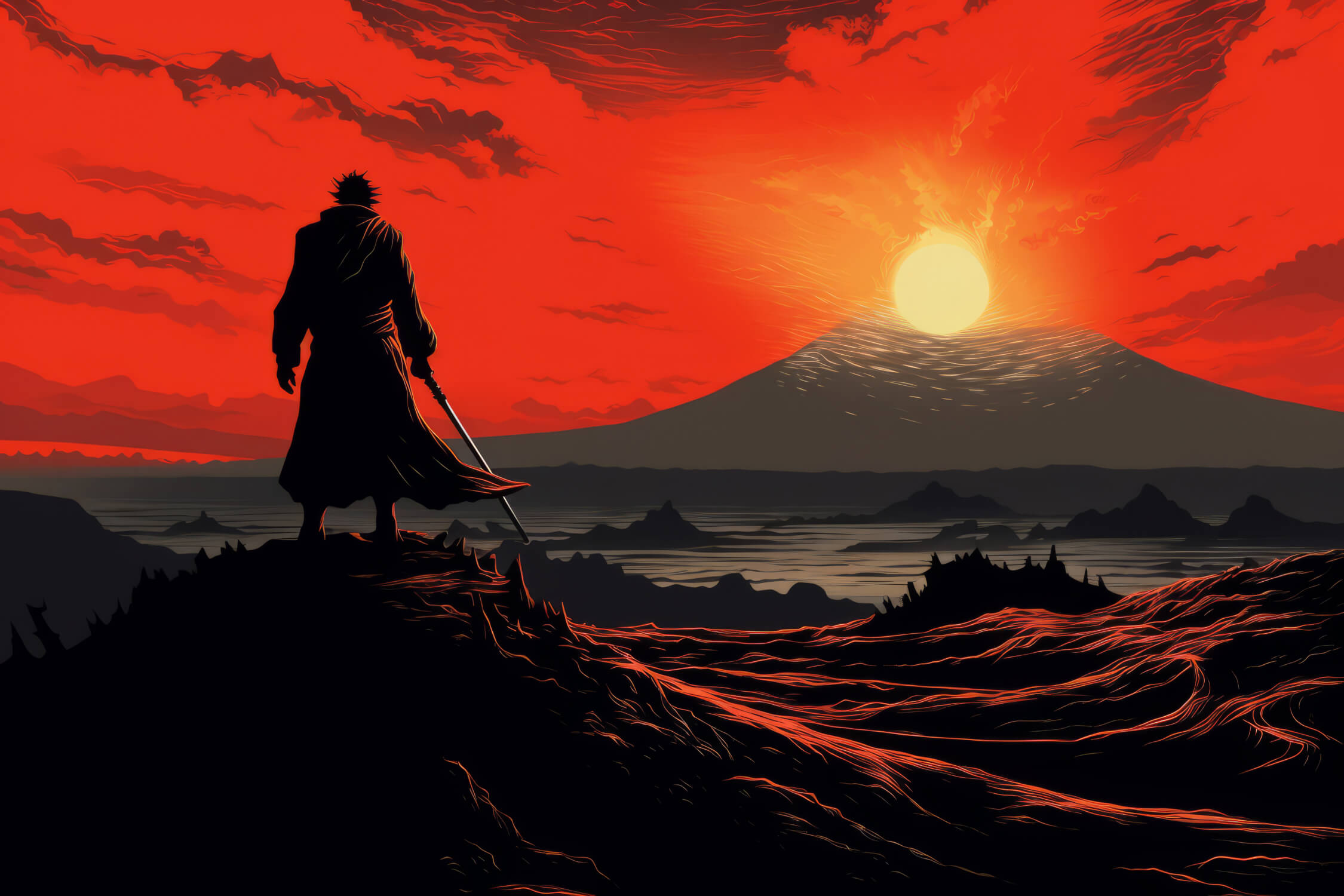 Dieses Anime-Tapeten-Mural fängt eine dramatische Szene ein, in der eine geheimnisvolle Silhouette vor einem flammenden Sonnenuntergangshimmel steht. Die Komposition verbindet meisterhaft tiefe karminrote Farbtöne mit goldenem Sonnenlicht und schafft eine Atmosphäre epischer Größe. Das panoramische Anime-Wandbild zeigt einen auffälligen Kontrast zwischen der dunklen Kriegerfigur und dem lebendigen rot-orangefarbenen Horizont, während entfernte Berge und Landschaften dieser fesselnden Szene Tiefe verleihen.