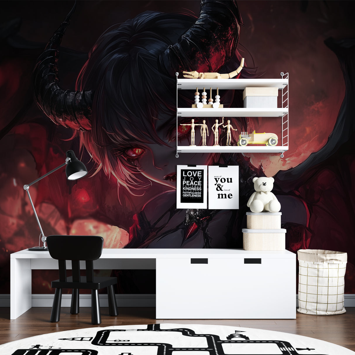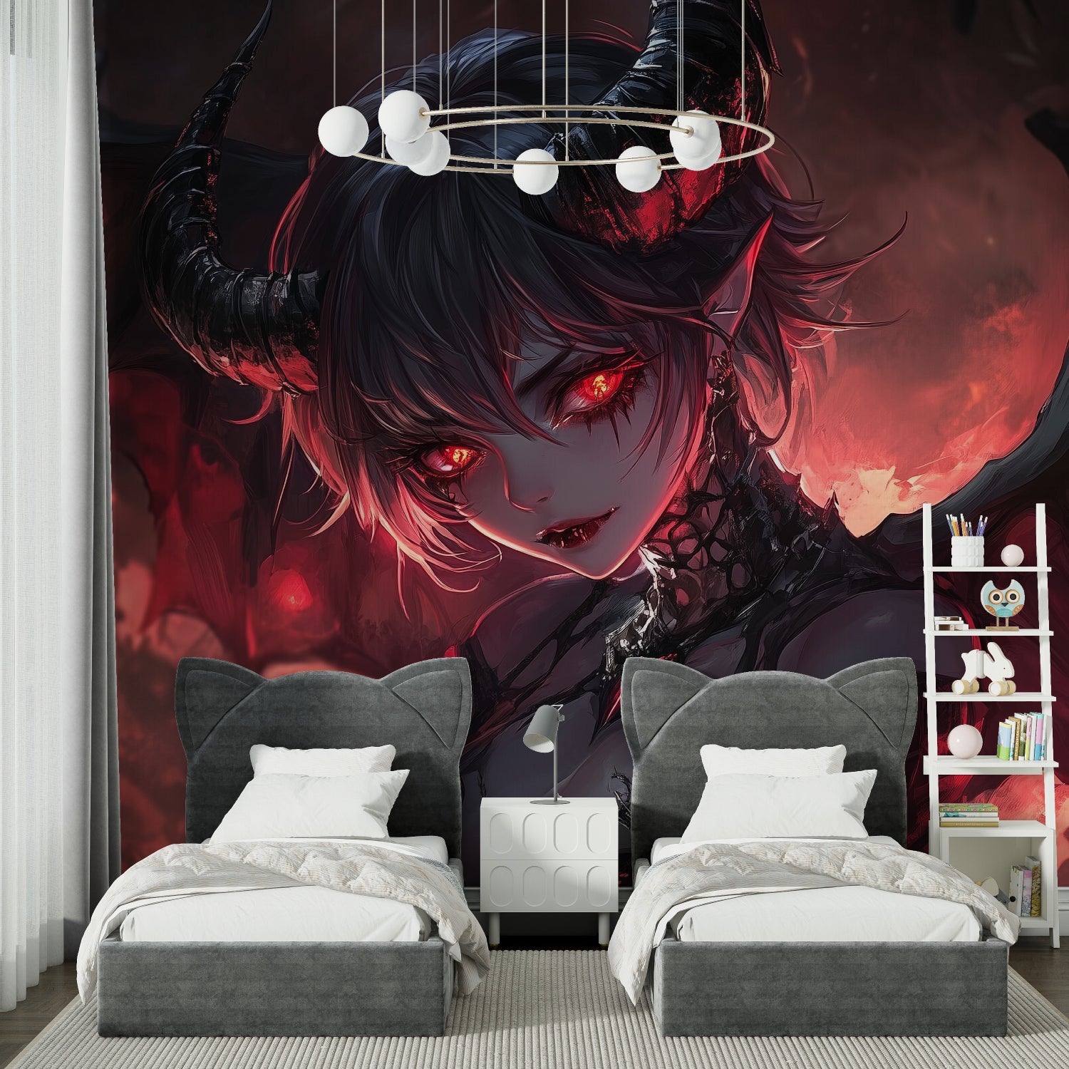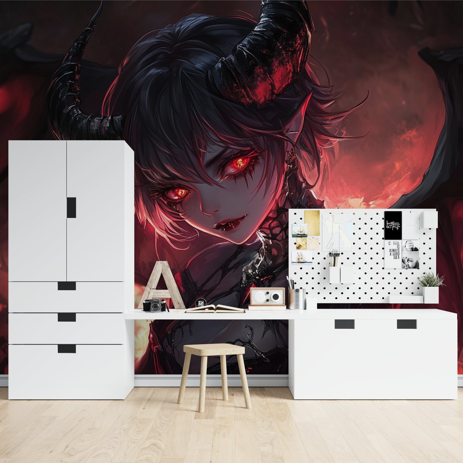 Dieses Anime-Tapeten-Mural zeigt eine eindrucksvolle künstlerische Vision mit seiner dramatischen roten und schwarzen Farbpalette. Die eindringliche Komposition präsentiert intensive karminrote Töne vor tiefen Schatten und schafft eine Atmosphäre dunkler Fantasie. Das japanische Anime-Stil-Design zeigt außergewöhnliche Details in jedem Pinselstrich, von den glänzenden ätherischen Augen bis zu den komplexen dunklen Elementen, die der gesamten Komposition Tiefe und Geheimnis verleihen.