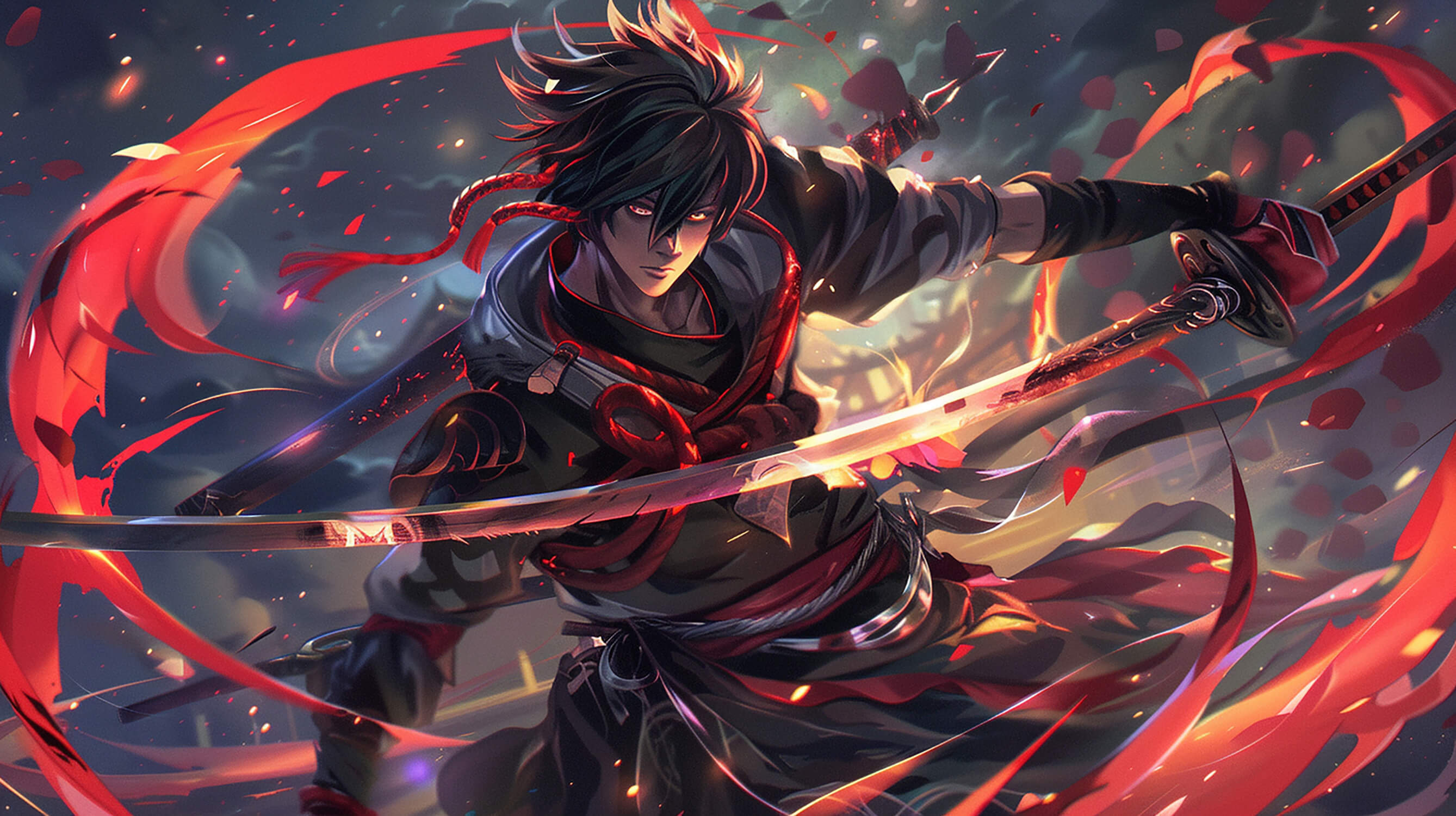Dieses Anime-Kampf-Wandbild zeigt einen mächtigen Krieger in dynamischer Bewegung, dargestellt in auffälligen Schwarz- und Karmesintönen vor einem turbulenten Hintergrund. Die dramatische Komposition enthält wehende rote Bänder und goldene Glut, die durch die stürmische Atmosphäre tanzen, während das Manga-Stil-Kunstwerk intensive Action mit kräftigen Linien und dramatischen Schatteneffekten einfängt, die Tiefe und Bewegung erzeugen.