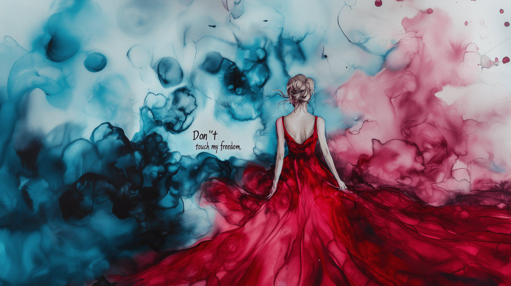 Diese Aquarell abstrakte Tapete fängt ein faszinierendes Zusammenspiel von tiefem Türkis und Karmesinrot ein und zeigt eine auffällige künstlerische Komposition. Das Herzstück präsentiert ein elegantes rotes Kleid, das sich anmutig in wirbelnde Aquarelleffekte verwandelt, während dramatische blau getönte Wolken einen kraftvollen Kontrast schaffen. Das künstlerische Wandbild enthält zarte tintenähnliche Details und ätherische Farbverläufe, die dem Design Tiefe und Bewegung verleihen.