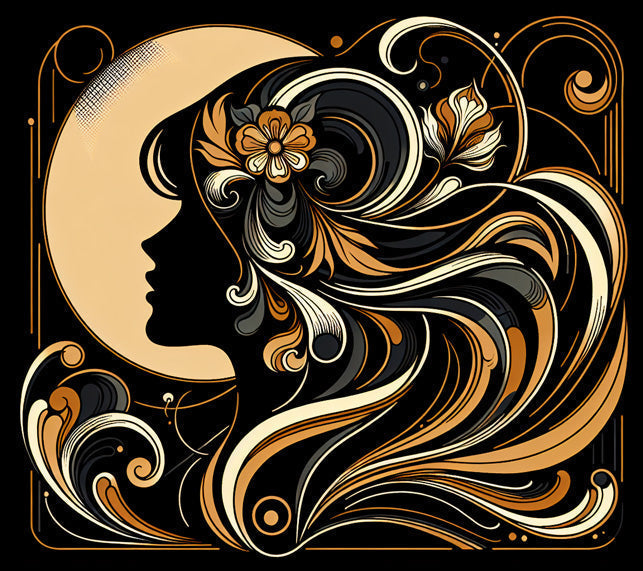 Diese Art-Deco-Tapete zeigt ein elegantes Silhouetten-Design vor einem dramatischen schwarzen Hintergrund. Die fließenden Kurven und Wirbel in Gold, Creme und Kohle schaffen ein faszinierendes Muster, das die Raffinesse der Art-Deco-Ära verkörpert. Ein goldener Mond bietet einen leuchtenden Hintergrund, während filigrane Jugendstil-Tapeten-Details wie die zarte Blume und anmutige Ranken eine meisterhafte künstlerische Komposition demonstrieren.