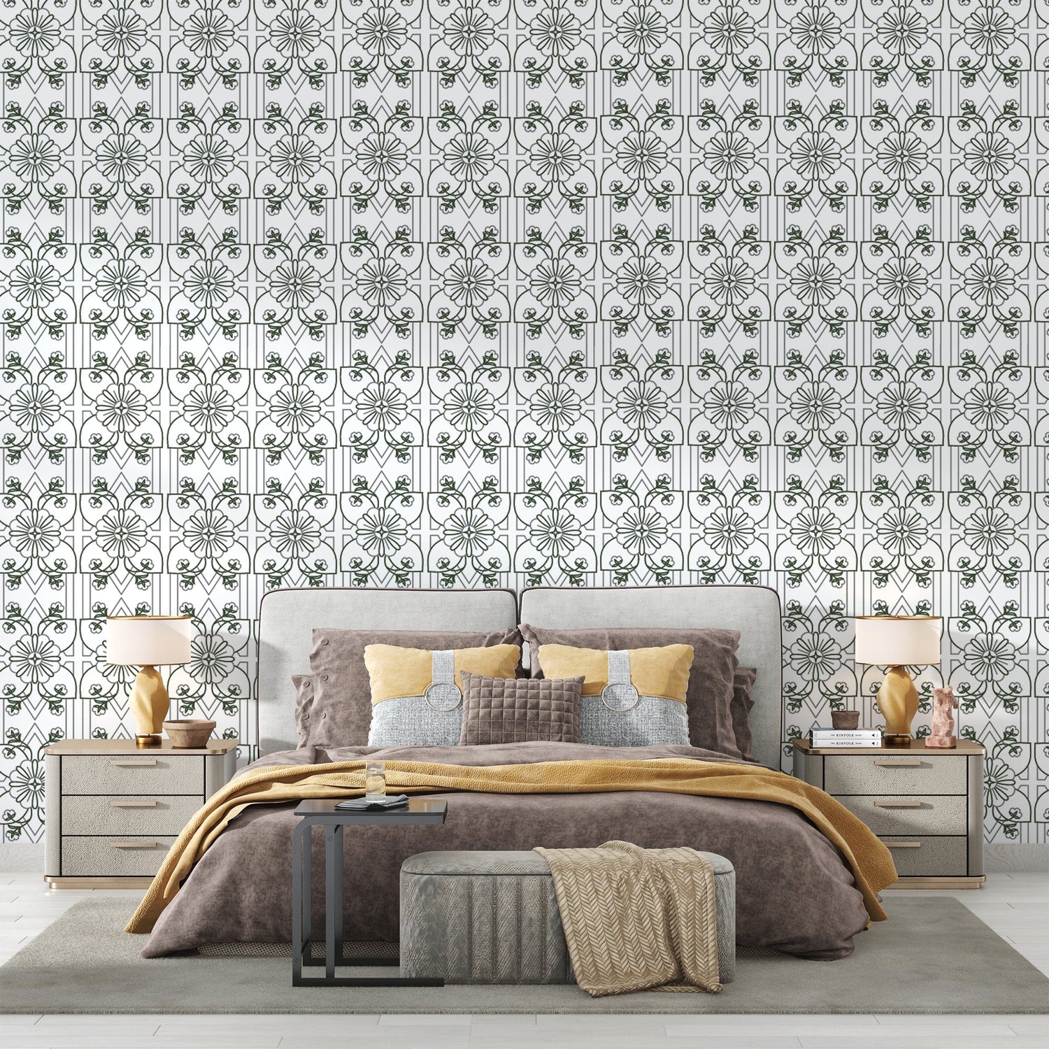 Diese Jugendstil-Tapete zeigt ein elegantes geometrisches Muster, bei dem zarte florale Motive mit symmetrischen Designs verschmelzen. Die feinen grünen Umrisse vor einem klaren weißen Hintergrund schaffen eine anspruchsvolle geometrische Blumen-Tapete, die das Wesen klassischer dekorativer Künste einfängt. Jedes Element wiederholt sich präzise, um ein komplexes Gitter aus Sonnenstrahlenblumen und anmutigen botanischen Details zu bilden.