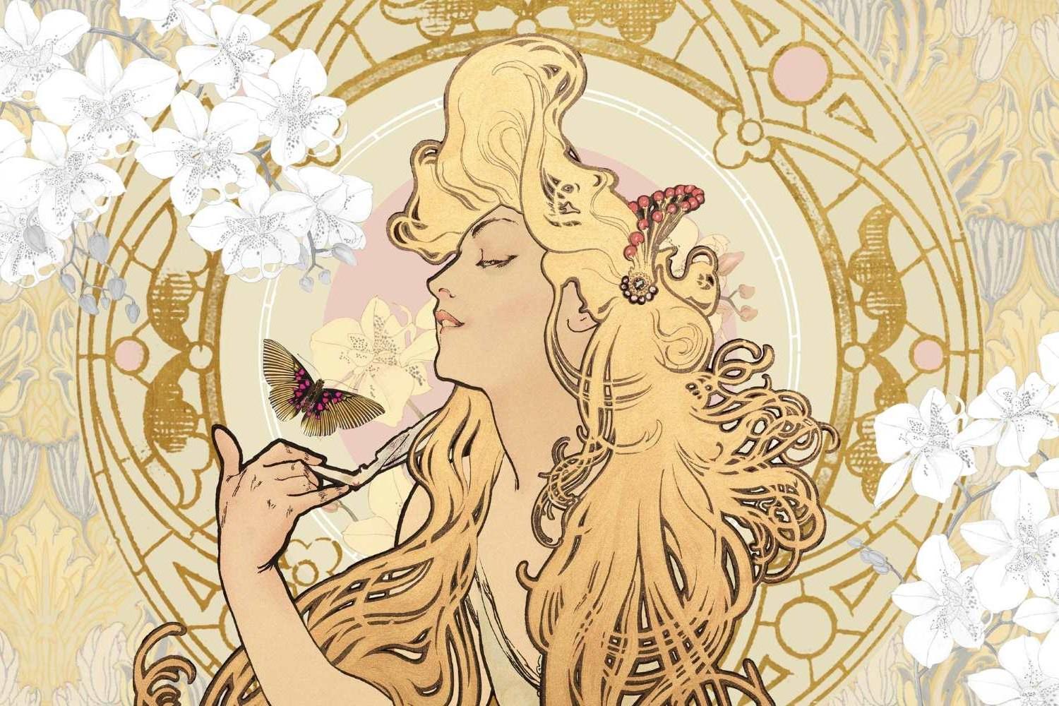 Diese Jugendstil-Tapete zeigt ein bezauberndes Porträt in glänzenden goldenen Tönen, das die charakteristischen fließenden Linien und natürlichen Motive der Epoche verkörpert. Die zentrale Figur tritt aus einem kunstvollen runden Rahmen hervor, der mit komplexen geometrischen Mustern verziert ist, während zarte weiße Blüten und ein anmutiger Schmetterling eine harmonische Komposition schaffen. Die goldene Art-Deco-Tapete verbindet sanfte Beigetöne mit metallischen Akzenten und erzeugt ein raffiniertes Spiel von Licht und Schatten.