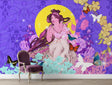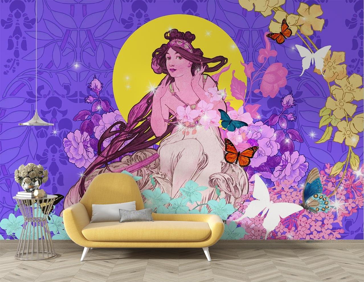 Diese bezaubernde Jugendstil-Tapete zeigt eine meisterhafte Mischung aus Fantasie und Eleganz und präsentiert eine traumhafte Komposition vor einem satten lila Hintergrund. Das Herzstück strahlt ätherische Schönheit aus, ergänzt durch zarte Schmetterlinge in lebendigem Orange und Türkis. Ein leuchtender goldener Mond schafft einen auffälligen Blickfang, während mintblaue und rosa Blumen weiche Farbschichten hinzufügen. Das Schmetterling-Wandbild integriert klassische Jugendstil-Muster, die sich nahtlos durch das Design ziehen.