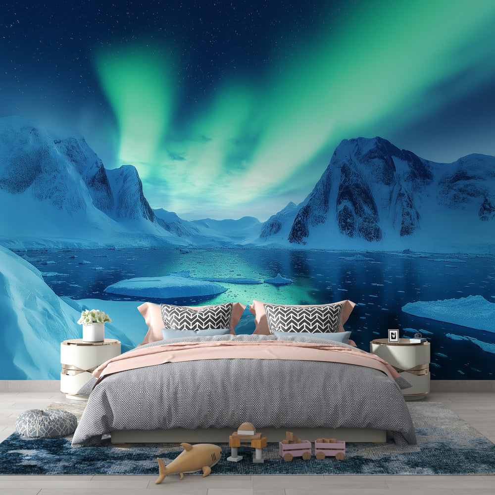 Verwandeln Sie Ihren Raum in ein Portal zum Polarkreis mit diesem Aurora-Borealis-Wandbild. Die ruhige Farbpalette aus leuchtendem Grün, tiefem arktischem Blau und reinem Weiß arbeitet in perfekter Synchronizität, um eine Atmosphäre ruhiger Pracht zu schaffen. Diese panoramische Landschaftstapete bringt die friedliche Einsamkeit und mystische Schönheit der Polarnacht in Ihr Interieur und bietet eine Flucht zu einem der großartigsten Naturphänomene.