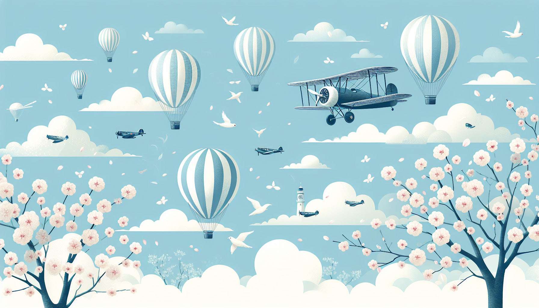 Diese Heißluftballon-Tapete schafft eine bezaubernde Himmelslandschaft, in der Vintage-Luftfahrt auf natürliche Schönheit trifft. Vor einem ruhigen blauen Hintergrund treiben gestreifte weiße Ballons friedlich zwischen bauschigen Wolken, während klassische marineblaue Doppeldecker durch die sanfte Brise gleiten. Zarte Kirschblüten mit weichrosa Blütenblättern rahmen die Szene ein, ihre Zweige reichen anmutig über die luftfahrtthematische Tapete, während weiße Schmetterlinge und Tauben dieser traumhaften Komposition sanfte Bewegung verleihen.