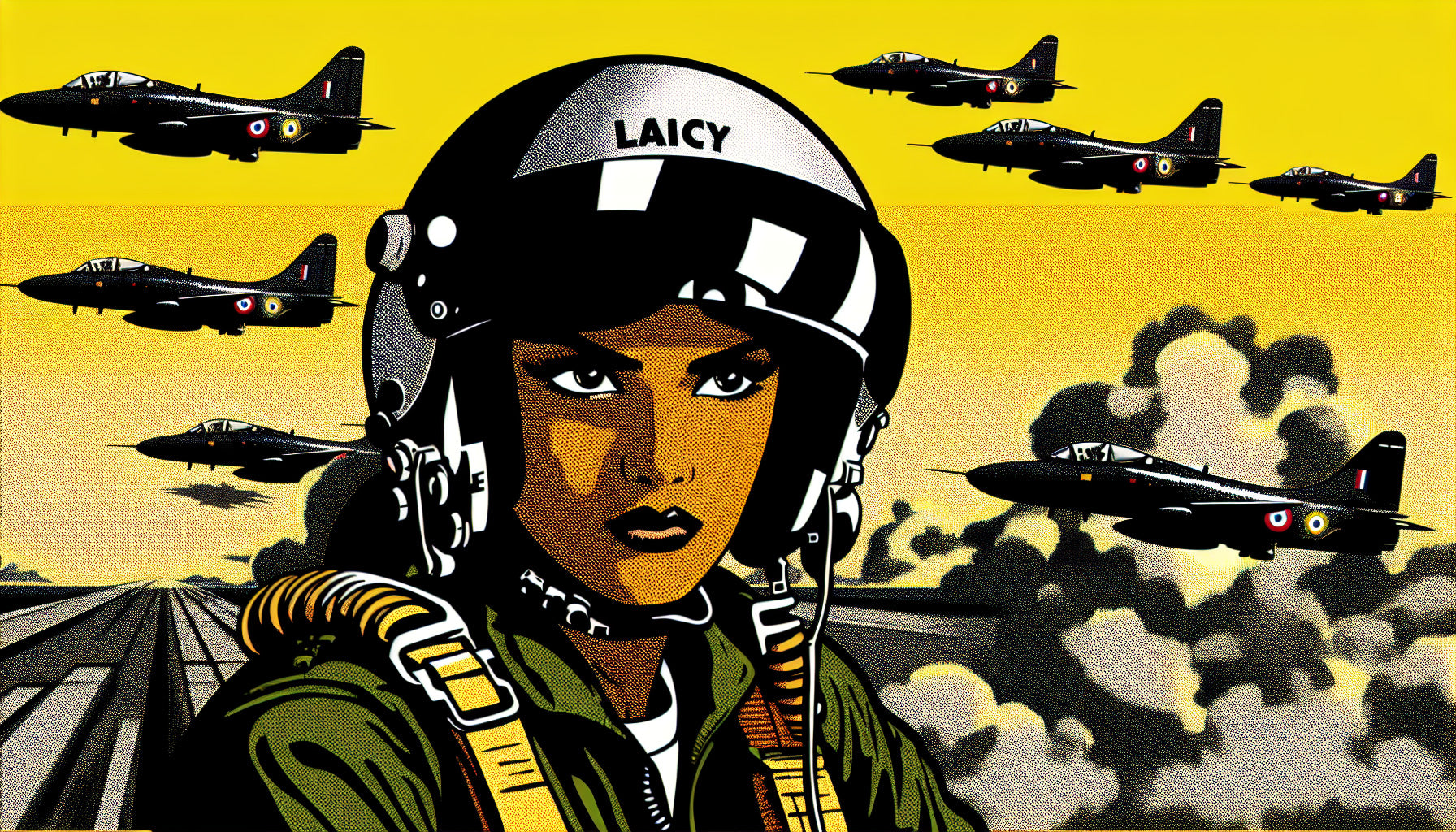 Diese Luftfahrt-Tapete zeigt eine kraftvolle Pop-Art-Komposition, in der kräftige Kontraste auf militärische Präzision treffen. Vor einem auffälligen senfgelben Himmel zeigt das Design ein detailliertes Porträt eines Fliegers in klassischer Flugausrüstung, komplett mit einem reflektierenden Helm mit der Aufschrift 'LAICY'. Mehrere Jagdflugzeug-Tapeten-Silhouetten bilden eine dynamische Formation am Horizont, während dramatische Wolken dieser retro-inspirierten Szene Tiefe verleihen.