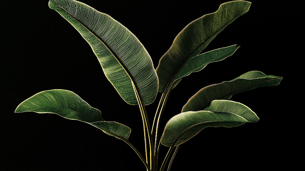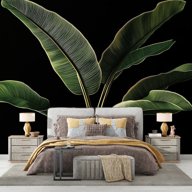 Diese tropische Blättertapete zeigt majestätische Bananenblätter, die in auffälligen Details vor einem tiefschwarzen Hintergrund dargestellt sind. Das großformatige Laub weist fachmännisch eingefangene Aderungsmuster auf, wobei jedes Blatt an den Rändern von einem goldgrünen Schimmer beleuchtet wird. Das botanische Wandbild schafft ein raffiniertes Spiel von Licht und Schatten, während der minimalistische schwarze Hintergrund die dramatische Wirkung dieser architektonischen tropischen Formen verstärkt.