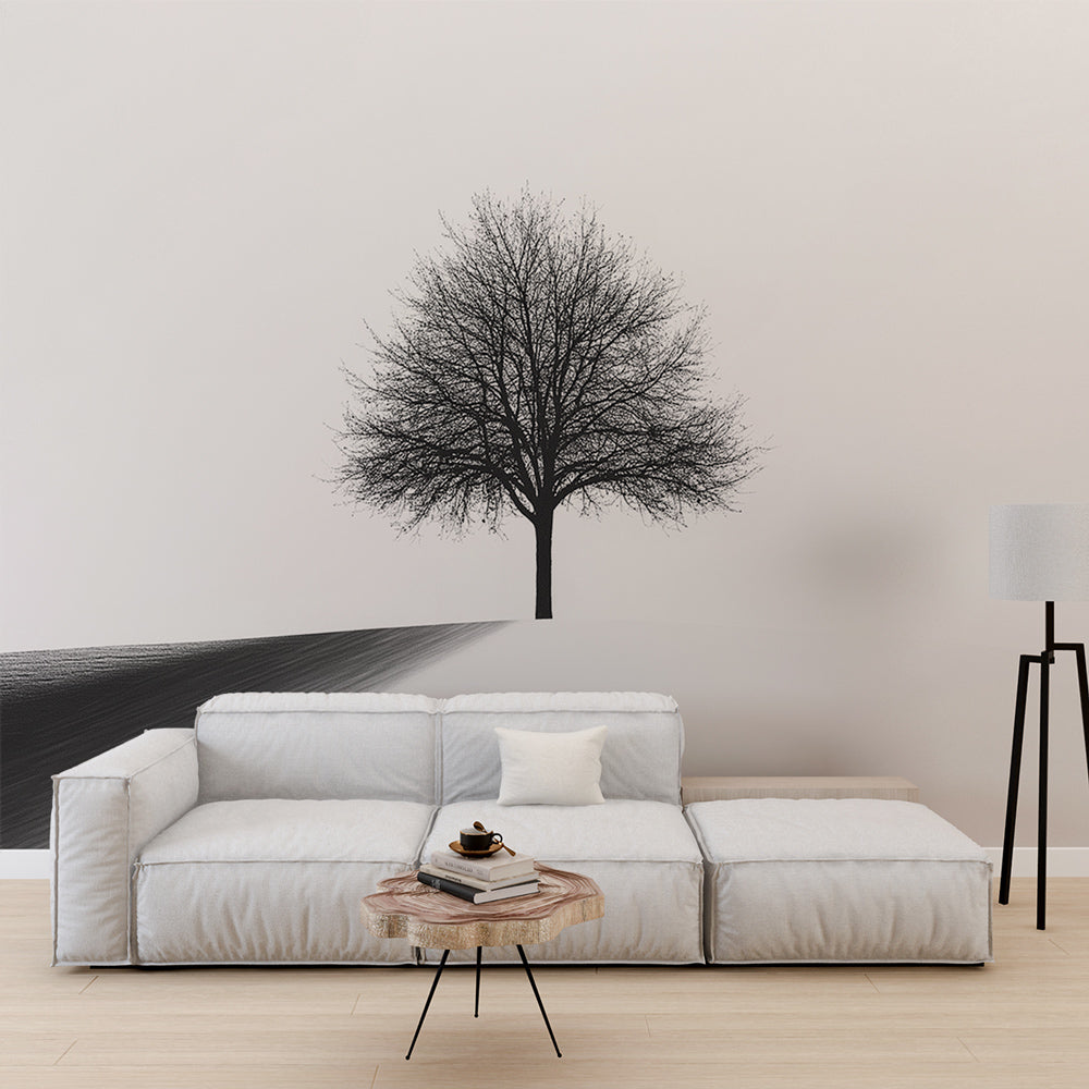 Dieses schwarz-weiße Baum-Mural bringt die stille Schönheit der Natur ins Innere.