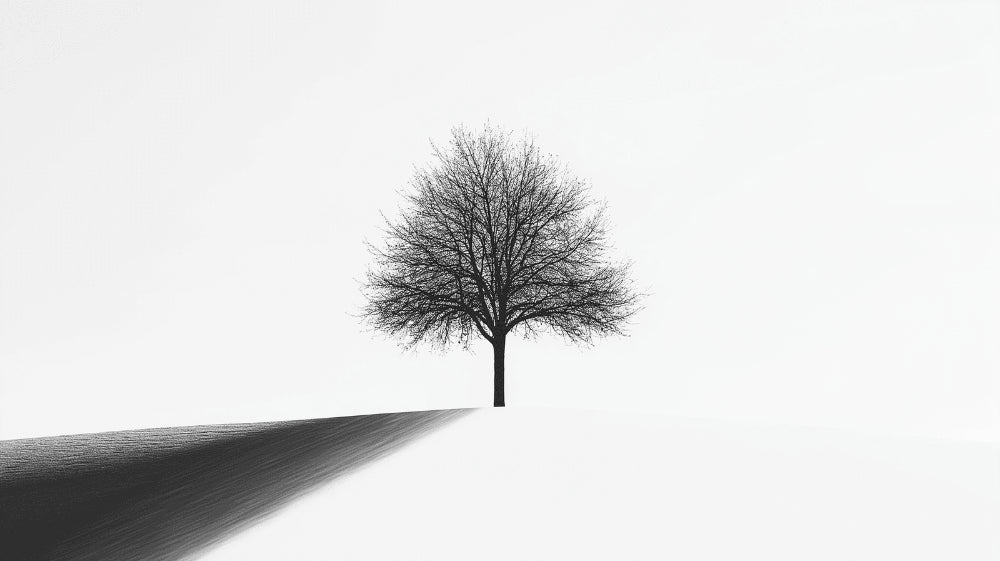 Diese minimalistische Baumtapete fängt die Essenz der ruhigen Einsamkeit durch eine eindrucksvolle monochrome Komposition ein. Der einsame Baum steht majestätisch vor einem makellosen Hintergrund, seine filigranen Äste schaffen eine zarte Silhouette gegen den blassen Himmel. Der dramatische Hang darunter wirft einen sanften Schatten, der Tiefe und Dimension zu dieser schwarz-weißen Panorama-Tapete hinzufügt, während die klaren Linien und das sorgfältige Gleichgewicht künstlerische Zurückhaltung verkörpern.