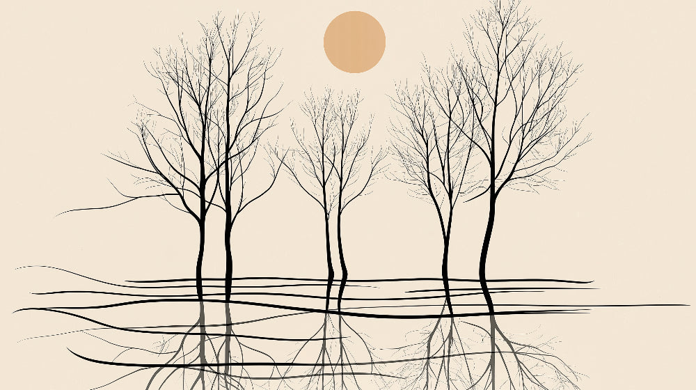 Diese minimalistische Baumtapete zeigt eine kunstvoll komponierte Szene nackter Äste, die gegen einen warmen beigen Hintergrund himmelwärts ragen. Die markanten schwarzen Silhouetten der Bäume schaffen einen dramatischen Kontrast, während die sanft getönte Sonne einen zarten Blickfang in der Komposition setzt. Die klaren Linien und das abstrakte Baumdesign spiegeln eine anspruchsvolle Schlichtheit wider, wobei horizontale Wellen Tiefe und Bewegung in die Bodenebene bringen.