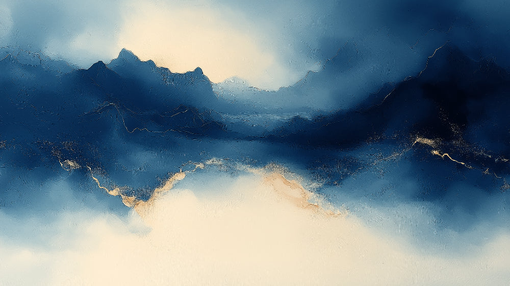 Diese abstrakte Bergtapete fängt die ätherische Schönheit einer nebligen Landschaft ein, in der tiefblaue Gipfel durch goldgetönte Wolken hervortreten. Die künstlerische Komposition verwebt Schichten von sattem Marineblau und sanften Beigetönen, während zarte goldene Akzente die Bergkämme wie Morgenlicht nachzeichnen. Diese moderne Landschaftstapete schafft eine verträumte, atmosphärische Szene, die den Blick in ihre Tiefen zieht.
