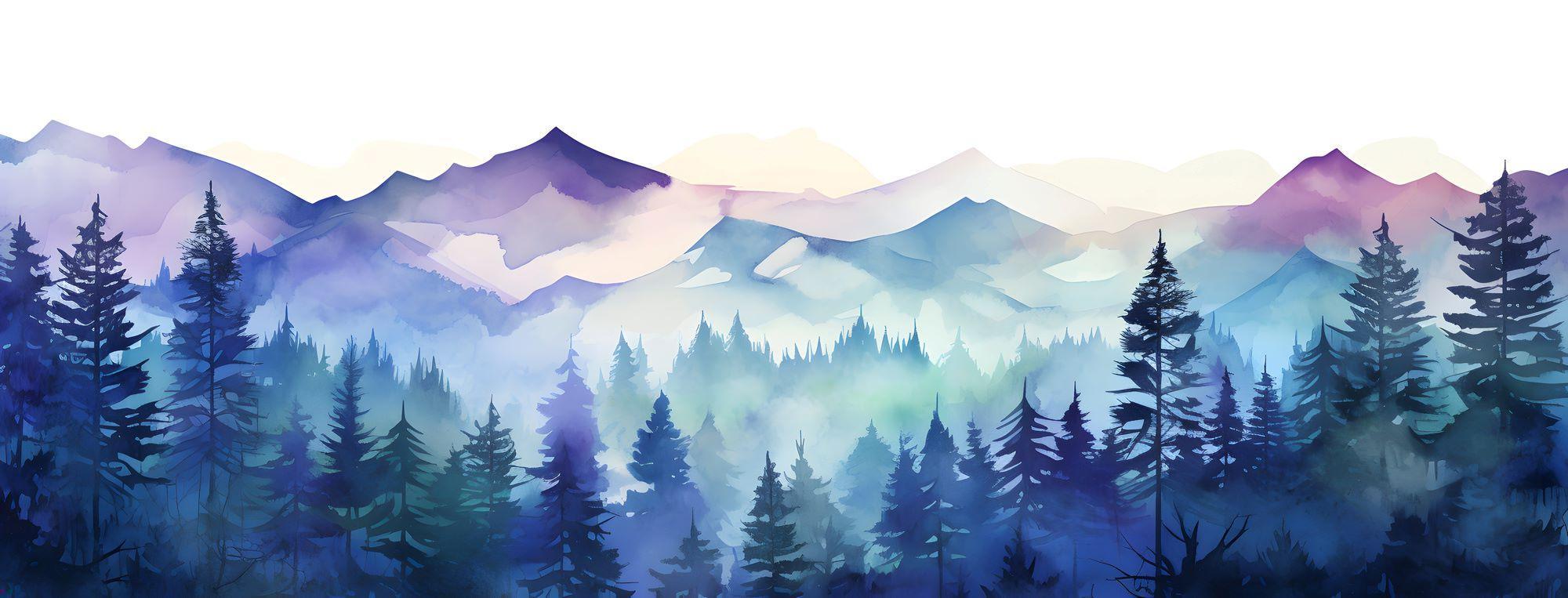 Diese Berglandschaft Tapete fängt die ätherische Schönheit nebliger Gipfel ein, dargestellt in traumhaften Aquarelltönen. Tiefe violette Gipfel verblassen in sanfte blau-grüne Täler, während silhouettierte Kiefern einen dramatischen Vordergrund gegen die geschichtete Bergkette Wandbild schaffen. Die künstlerische Aquarelltechnik vermittelt ein Gefühl von Bewegung und Tiefe, mit subtilen Farbverläufen, die die natürlichen Abstufungen alpiner Aussichten bei Tagesanbruch widerspiegeln.